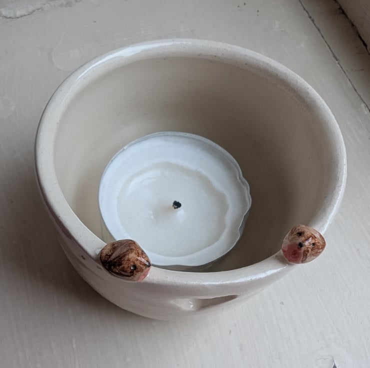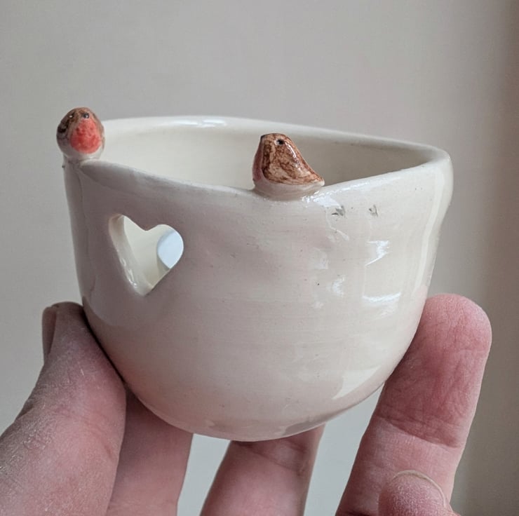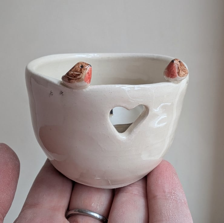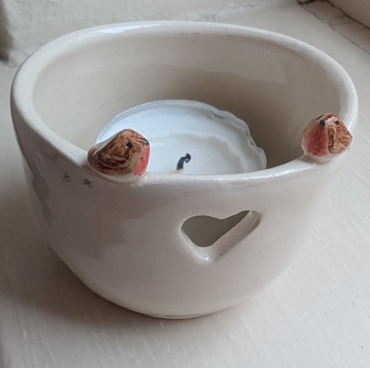 Pottery robin tea light candle holder with a heart cut out. There are 2 hand modelled birds perched on the side in white clay, hand painted holly and bird prints.