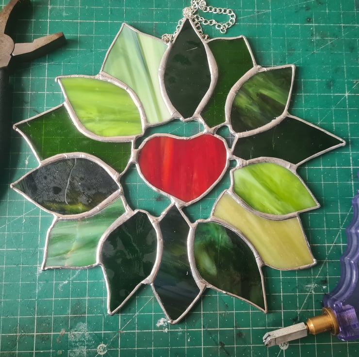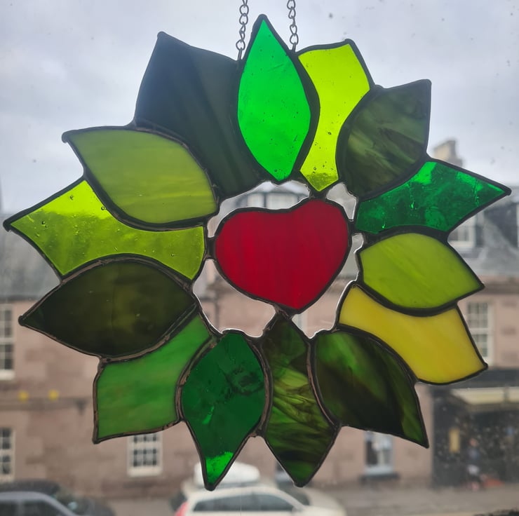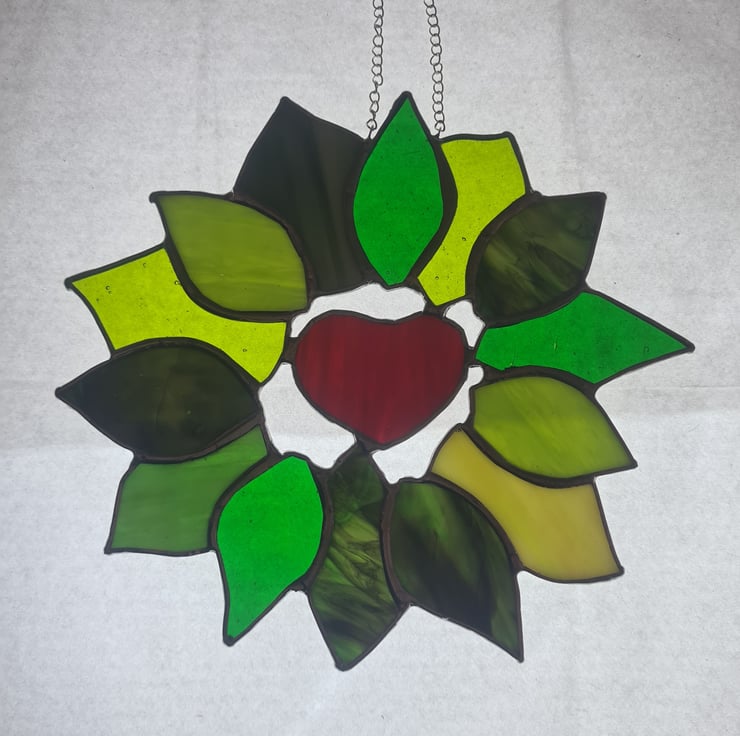 A beautiful mix of transparent, opaque and wispy green glass combine yo make this stunning heart wreath. Measuring 20x20cm approximately and made using the Tiffany method it is delicate but made to last and will enchant you for years to come! Piece comes with hanging chain and very strong adhesive hanger.