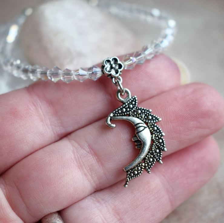 The glass beads are a bicone shape and have a subtle rainbow effect as the catch the light. The moon hangs from a little daisy bail right in the centre and is around an inch or 2.5 cm high.