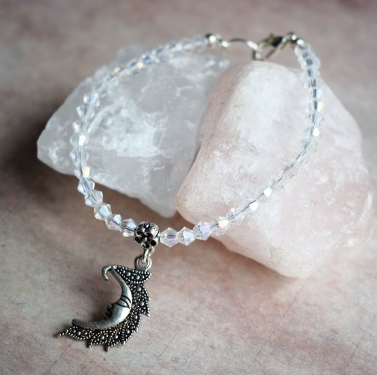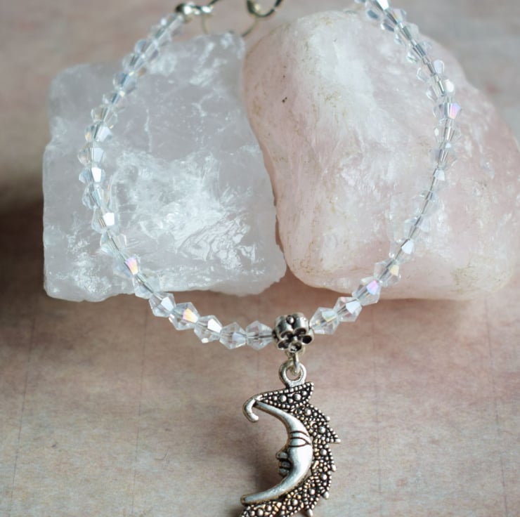 With its tiny ab clear glass beads and small crescent moon charm this bracelet is dainty enough that you could wear it for everyday but with the delicate sparkle of the beads it is easily pretty enough to wear for more special occasions too!