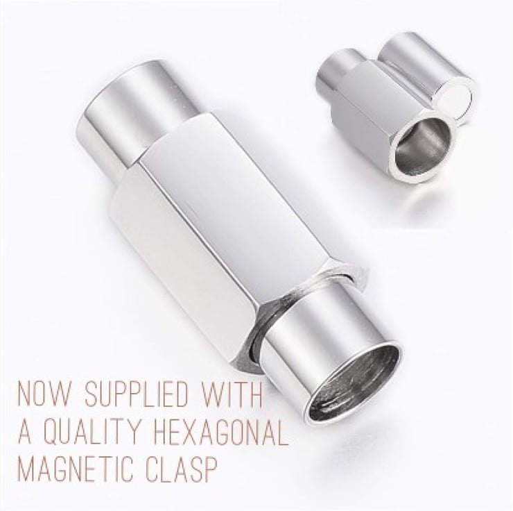 Fastens with a stainless steel clasp with a strong magnet.