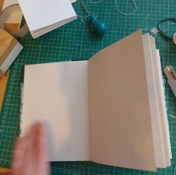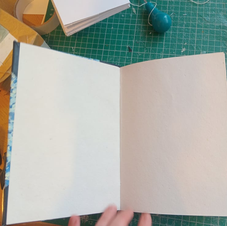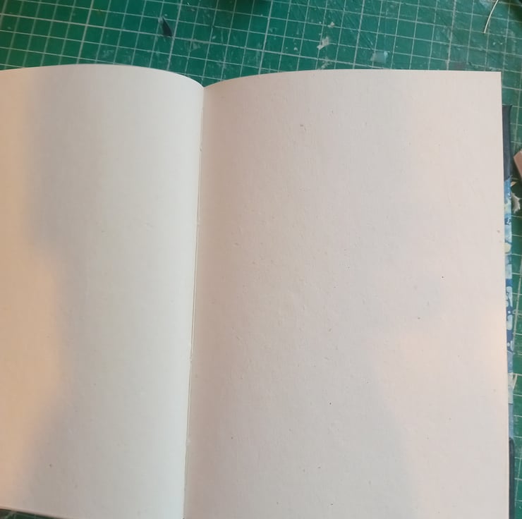 A5 Journal hand bound with tree free hemp paper by artway, with greyboard hardcover covered in printed marbled design paper and a leather spine. Last picture shows paper behaviour