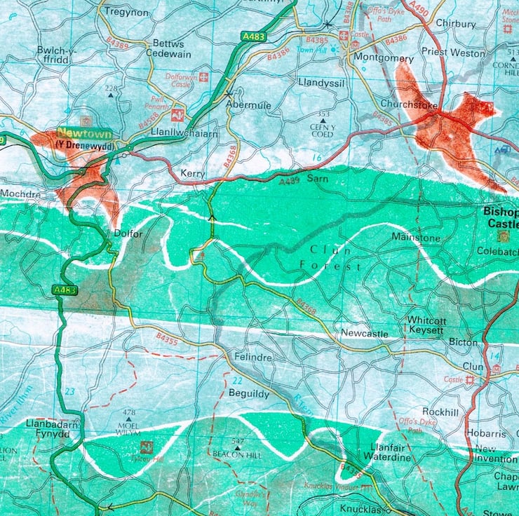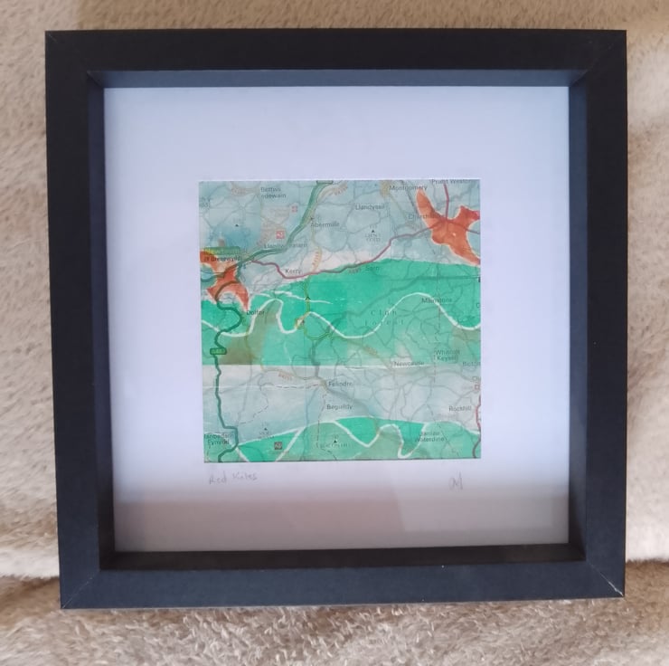 A monoprint of a pair of red kites soaring over the hills, hand printed onto a map of mid Wales. Places on the map include Newtown, Bettws Cedewain, Clun Forest and a section of the Offa's Dyke path. It is an original print, although I printed others using the same templates, each is unique. This one is in a white mount,framed in a simple black . Size of frame 17cm square.