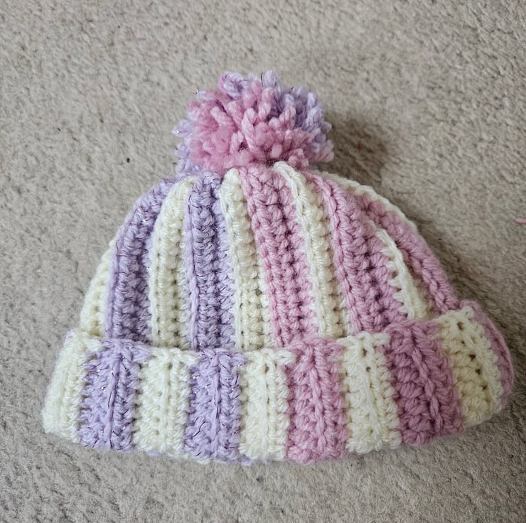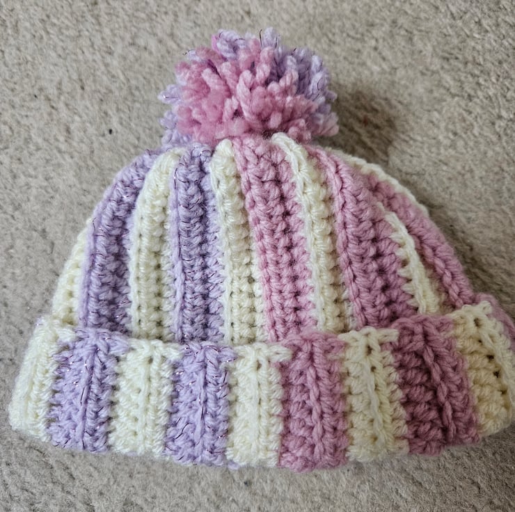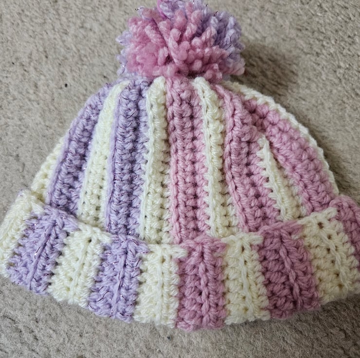A lovely pink and purple handmade crochet baby hat. Suitable for newborn