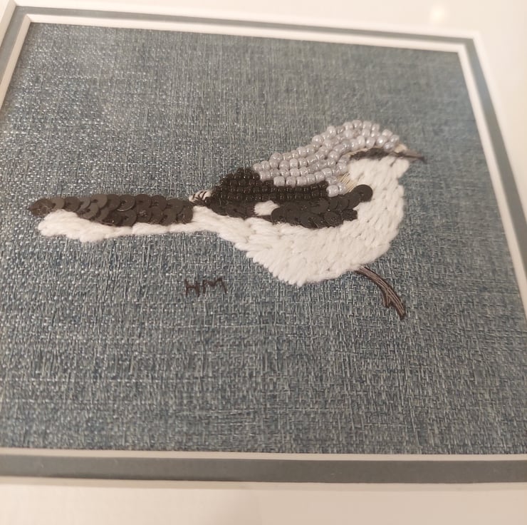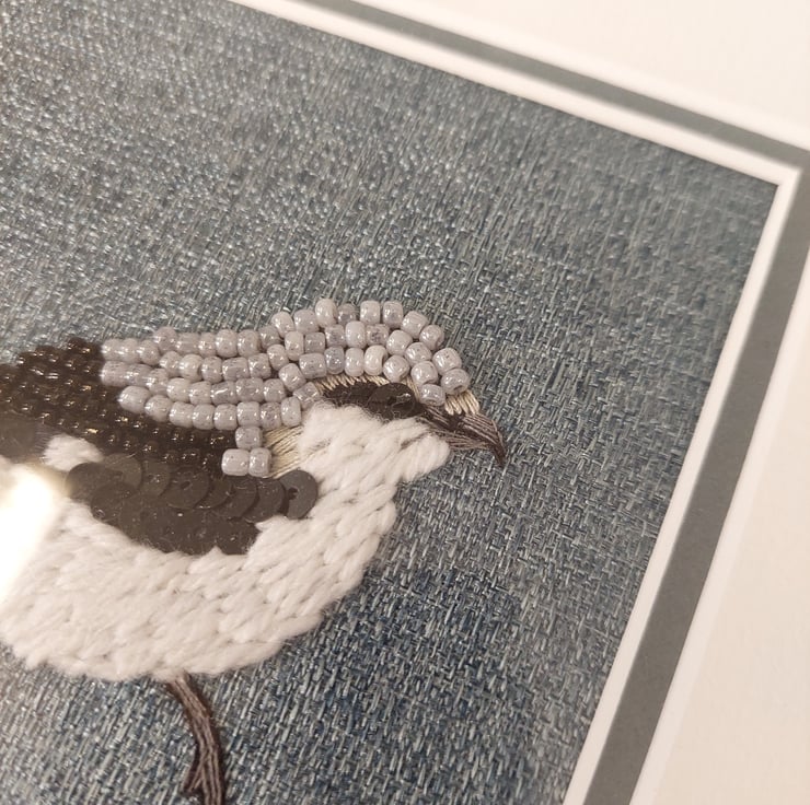 Original Great Grey Shrike Embroidery Artwork - Handcrafted with Sequins, Beads, and Denim Blue Fabric