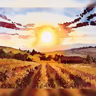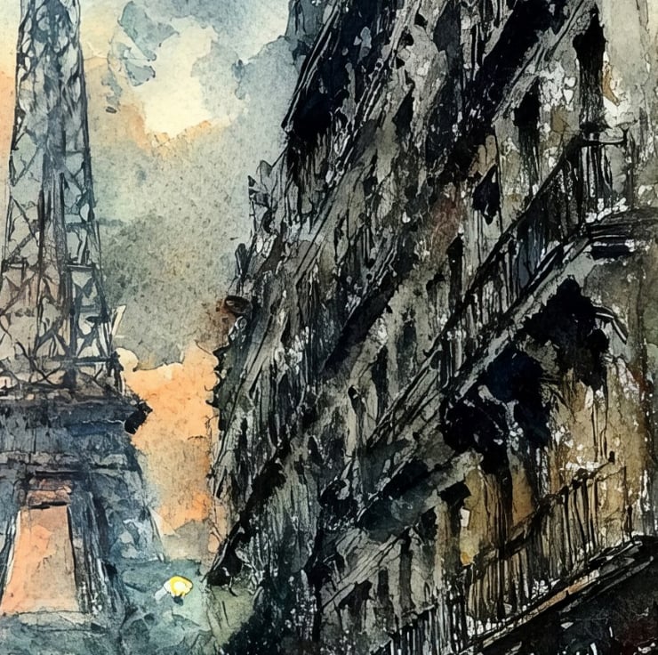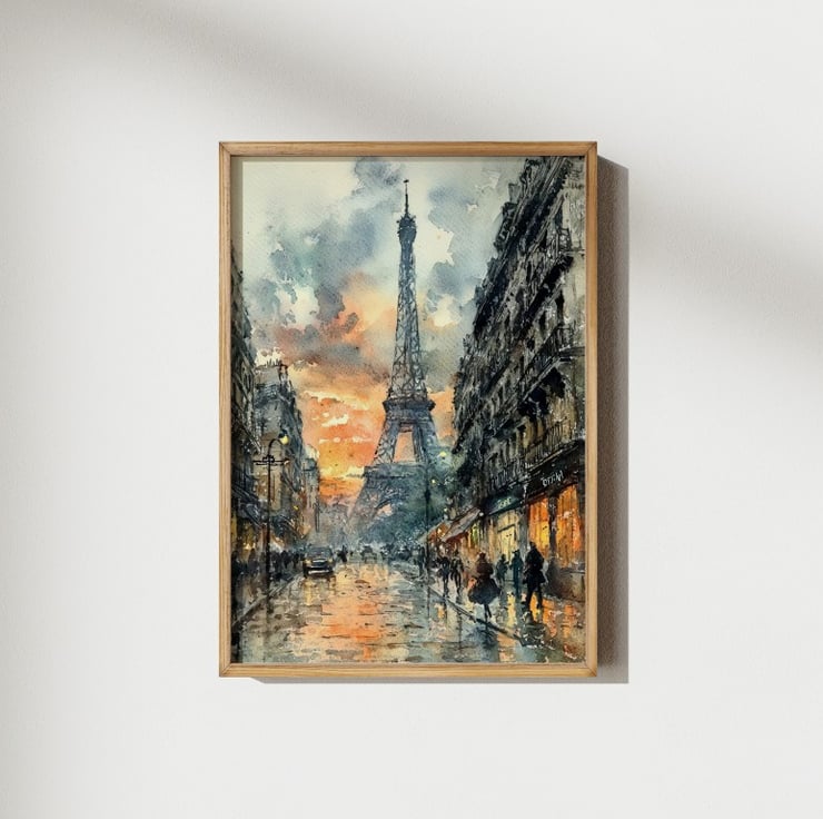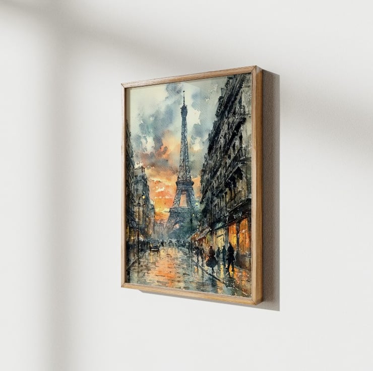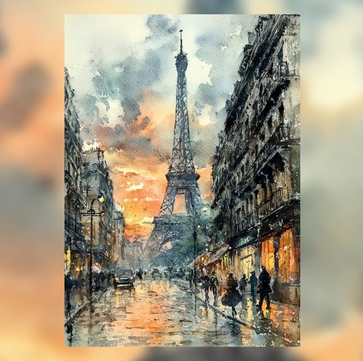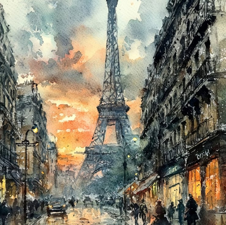 This watercolor painting beautifully captures the romance of a Paris sunset.