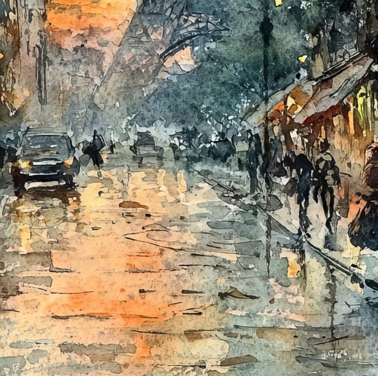 At the same time, the artist’s fluid brushstrokes and delicate washes of color add depth and movement to the scene. The soft play of light and shadow enhances the dreamy ambiance, making it feel as if you are strolling through Paris at twilight. Additionally, the detailed Haussmann-style buildings bring authenticity and elegance, completing the painting’s charm.