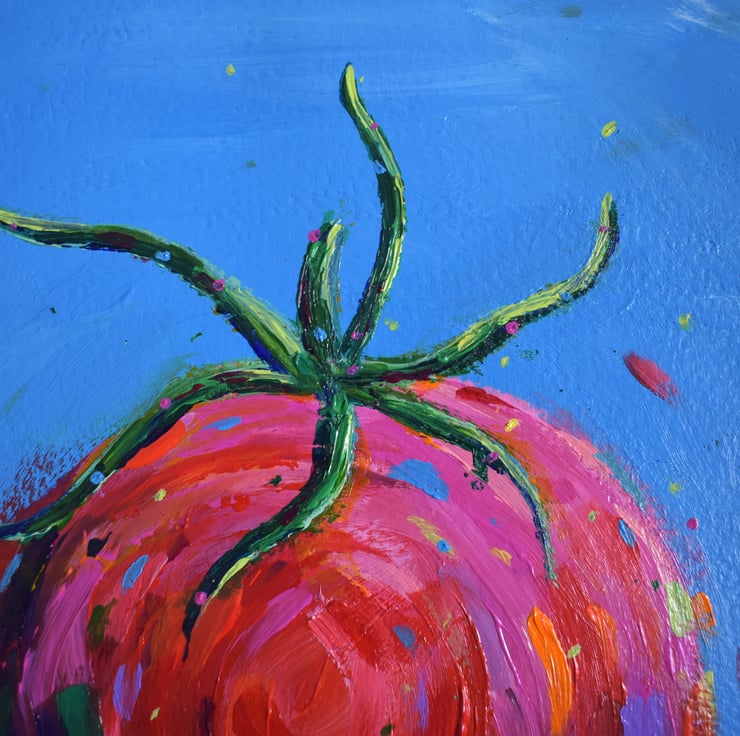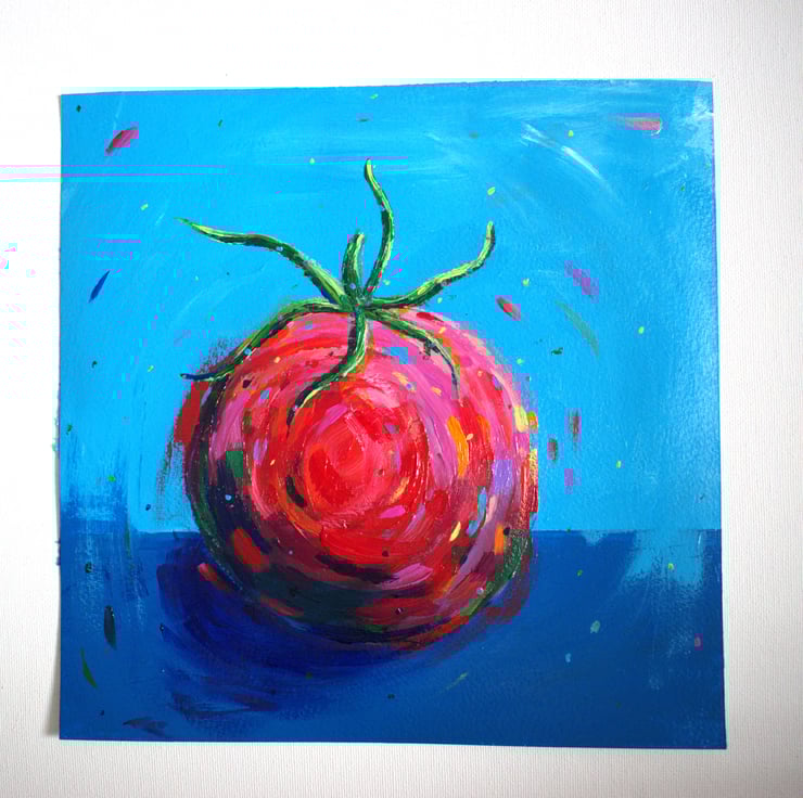 Study of tomato against a blue background. I used acrylic paint on watercolour paper (300gsm paper) and finished with a gloss varnish. The painting is signed on the back and measures 25 x 25 cm.