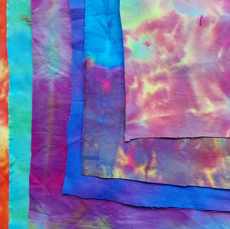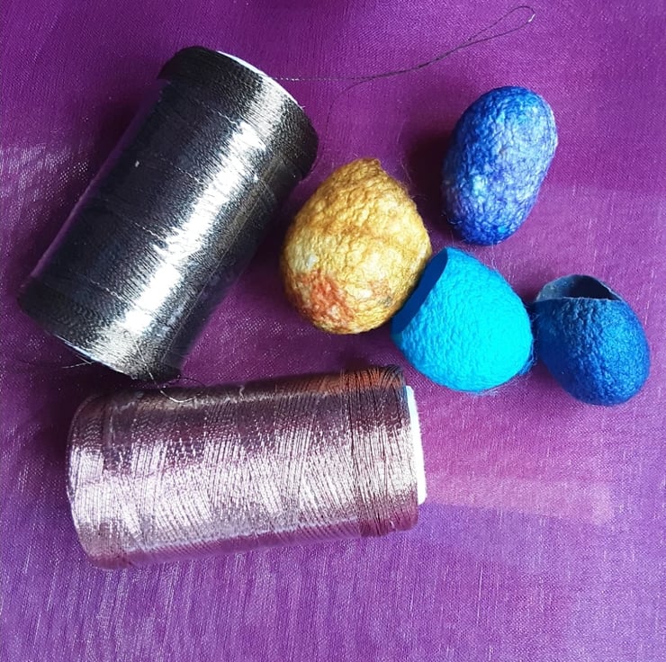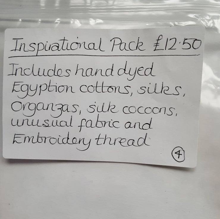 This is a bundle of fabrics taken from my own stash including my own hand dyed Egyptian cottons, silks, organza and embroidery thread and some silk cocoons and silk throwers waste.