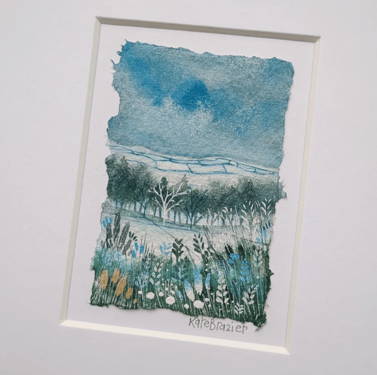 This piece is created using gouache paint on handmade Khadi paper, it has been worked into with water soluble pencils and Luminance colourfast pencils. It is then held in place with artist quality Neutral pH adhesive and float mounted in a custom mount.