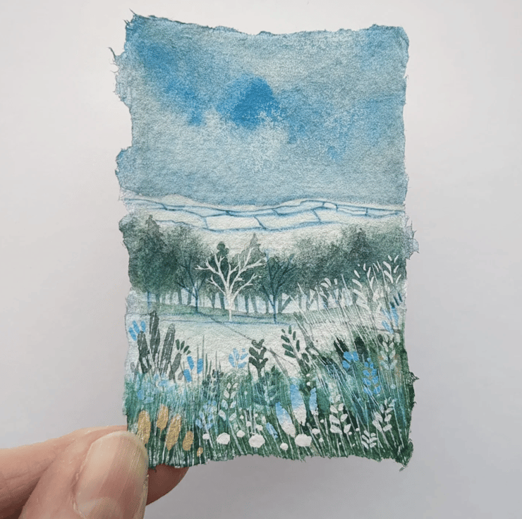 'A Little Winter Walk' is a tiny, mixed media miniature float mounted into a custom A5 mount.