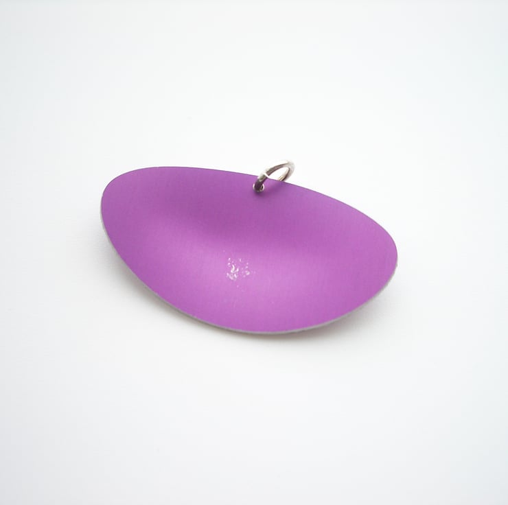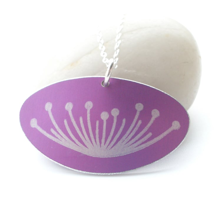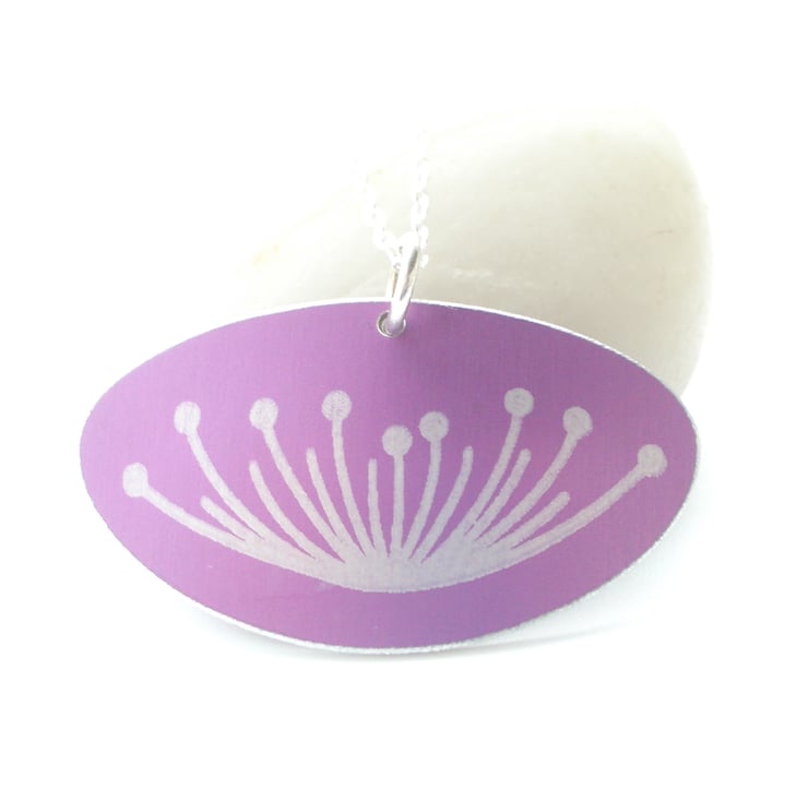 This lovely oval pendant is made from anodised aluminium which I have hand dyed in pink and printed with a silver cow parsley design. The dye is made permanent through heat and becomes sealed in to the surface of the metal. I cut out the oval shape by hand with a jeweller's saw and file the edges to give a nice smooth finish.