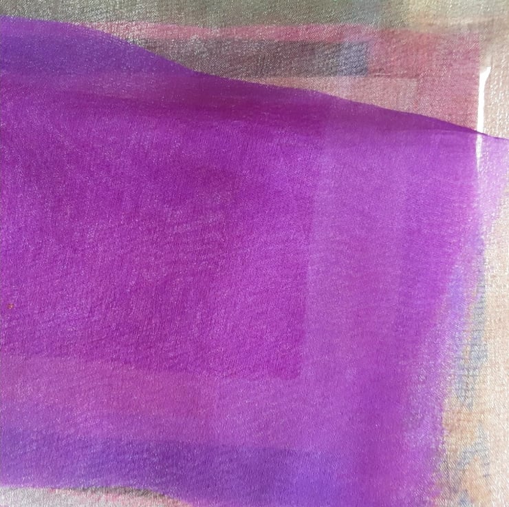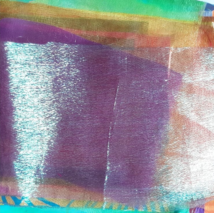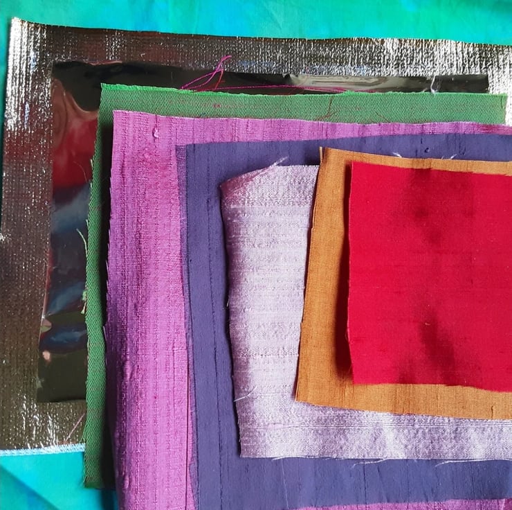 This is a bundle of fabrics taken from my own stash including my own hand dyed Egyptian cottons, silks, organza and embroidery thread and some silk cocoons and silk throwers waste.