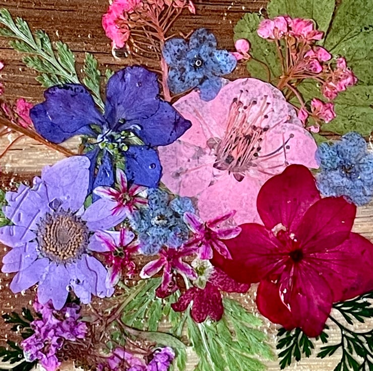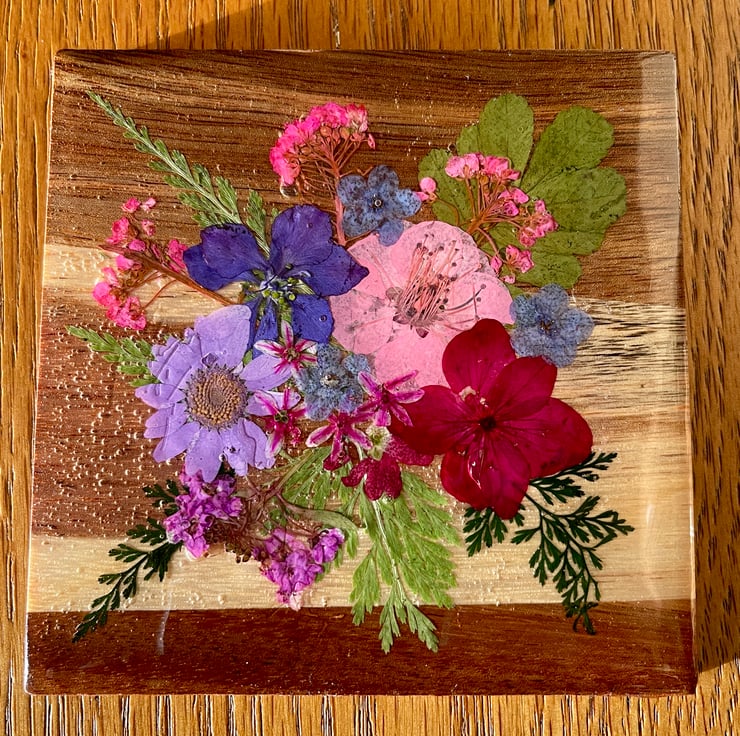 This is a 10cm square acacia wood coaster with real pressed flowers. The wood is lovely showing the natural striations. There is a variety of dried flowers and leaves. Underneath there are foam circles to protect the surface. The top is coated with resin not only to protect the flowers and wood, but brings out the colours.