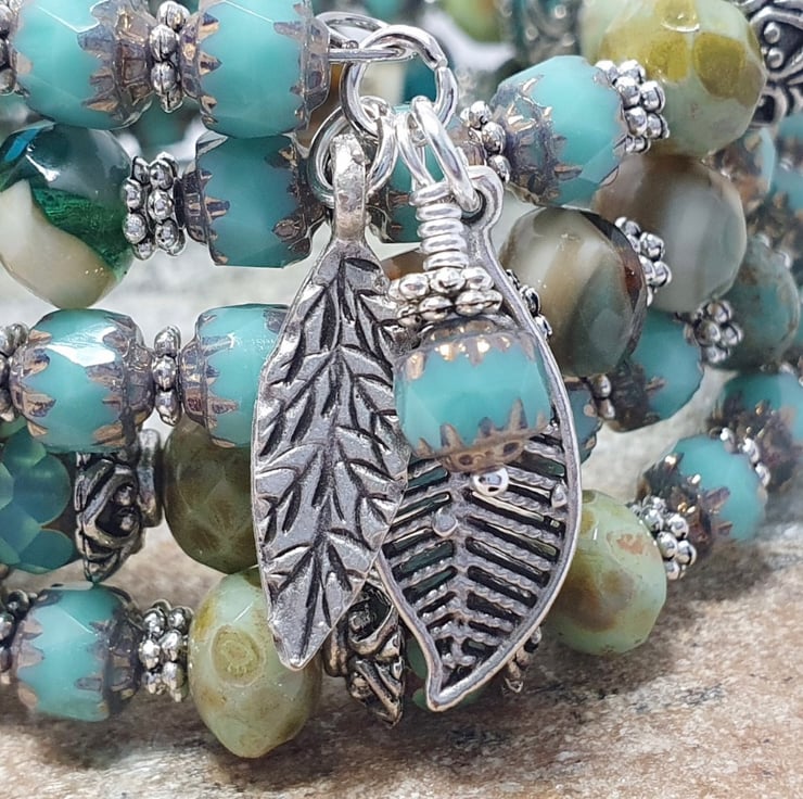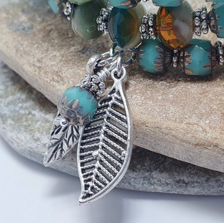 Finished with 2 different silver tone leaf charms to complete the floral boho look of this bracelet.
