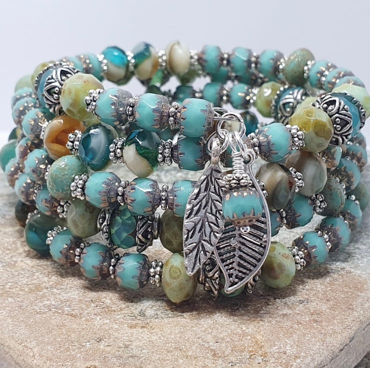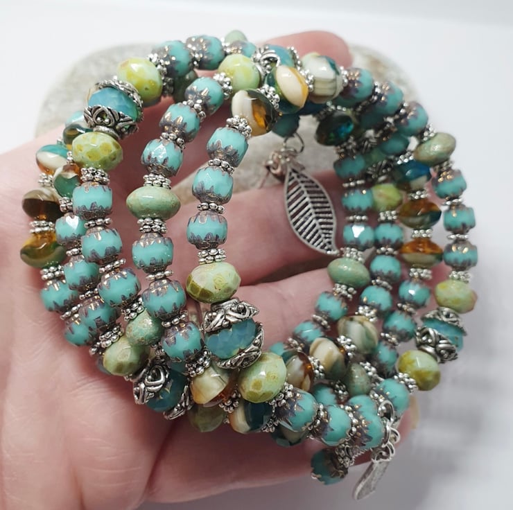 This beaded wrap bracelet has been handmade with an assortment of Czech glass beads in various colours of turquoise blue, turquoise green and blue/cream/topaz mix. This is a lovely chunky bracelet made using fire polished beads, cathedral shaped beads and irregular shaped beads. The beads have been grouped together in a repeating pattern and the glass beads are separated by tiny silver tone daisy spacers.