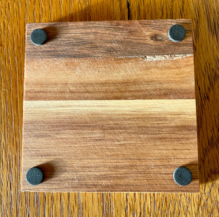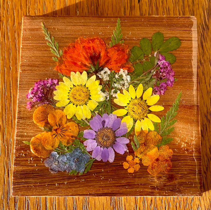 This is a 10cm square acacia wood coaster with real pressed flowers. The wood is lovely showing the natural striations. There is a variety of dried flowers and leaves. Underneath there are foam circles to protect the surface. The top is coated with resin not only to protect the flowers and wood, but brings out the colours.