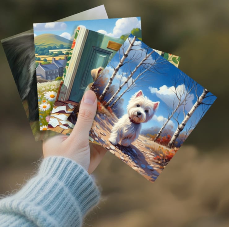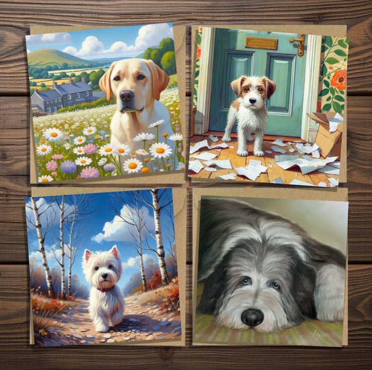 A collection of four 148mm square cards depicting different breeds of dog in action. Perfect for dog loving friends and family members. Each card has been professionally printed on FSC registered cardstock. Cards come with complementary kraft envelopes.