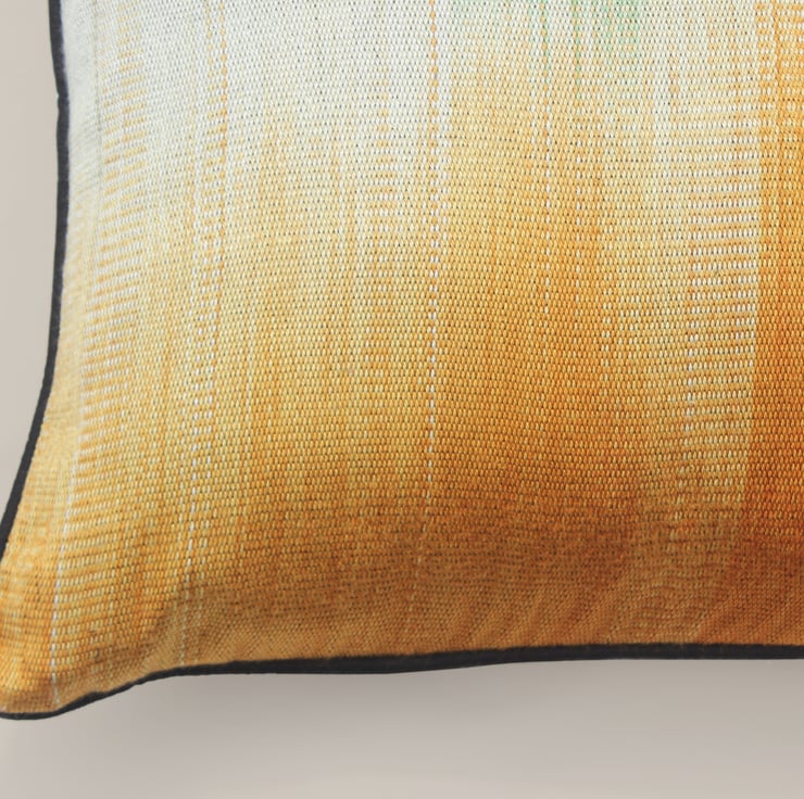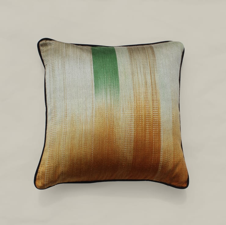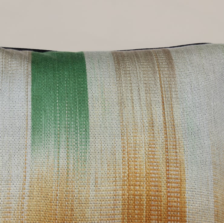 This silk hand-dyed and woven cushion is inspired by an evening sunset over Little Loch Broom and the coastal forest. Silva Solis is a one of a kind cushion, uniquely hand-dyed, this striking cushion evokes the promise of warm summer evenings.