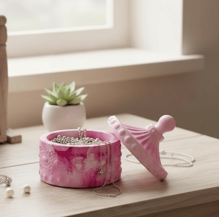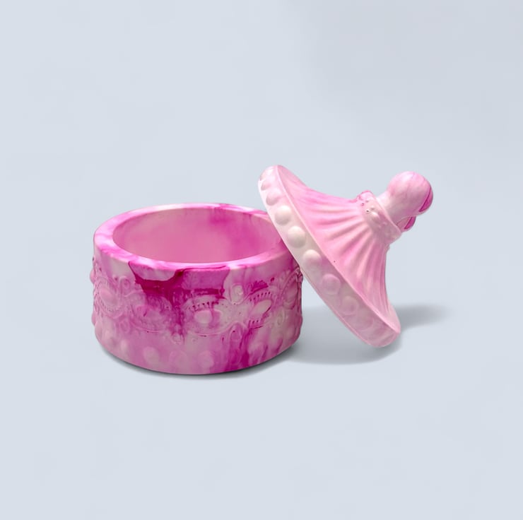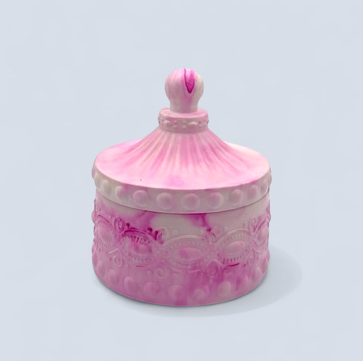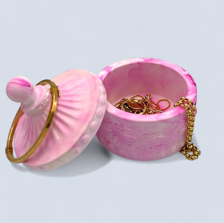 This ornate jewellery box features an embossed pattern that encircles the middle, with circular embellishments at the bottom and on the outside of the lid. The lid itself resembles a circus big top tent. It is made from a premium British plaster known as Crystacast, which has a dense, smooth, luxurious finish similar to marble and a lovely, weighty feel. This makes it perfect for storing keepsakes, trinkets, jewellery, or small treasures. The stunning pink marbling effect on this unique trinket pot ensures that each piece is a one-of-a-kind creation, making it an ideal gift for someone special or a delightful treat for yourself.