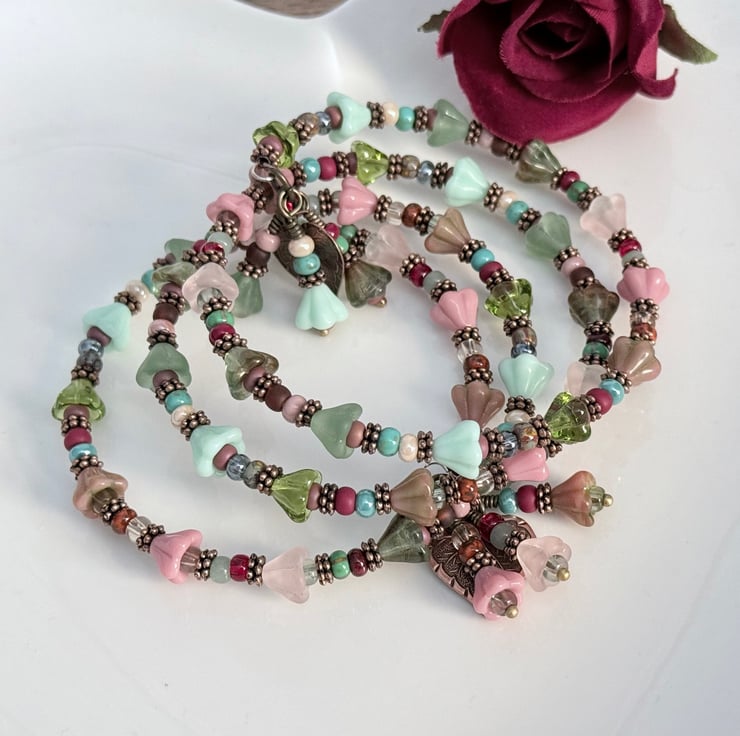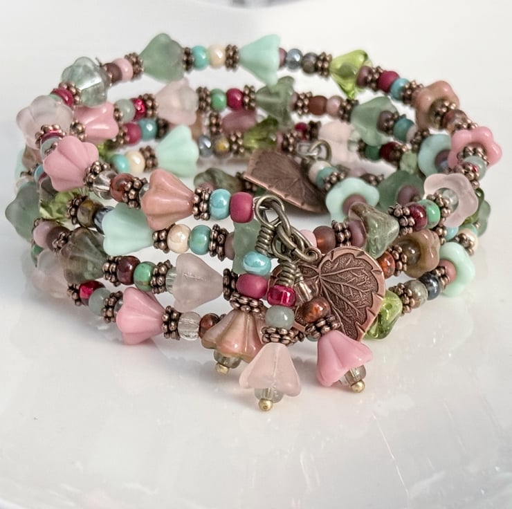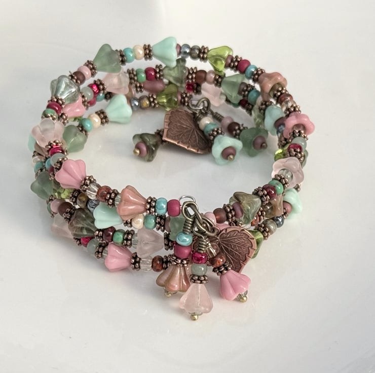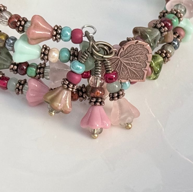 This summery floral bracelet is handmade with Czech glass bell flowers and small seed beads. The seed beads are in different tones of reds, blues, greens, and pinks, combined with pretty pastel glass bell flowers in shades of pink and green. The bracelet is finished with handmade charms made with more of the pink and green bell flowers and embossed copped leaf charms.