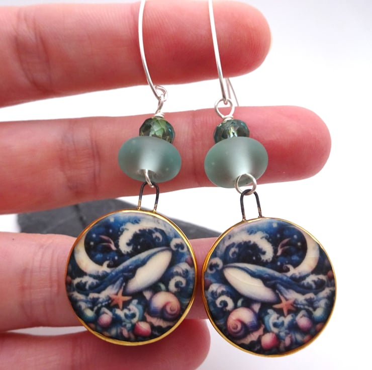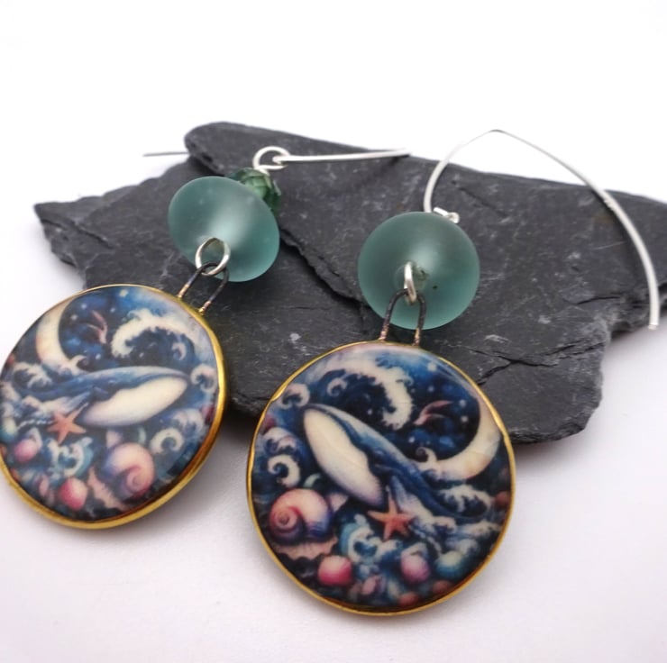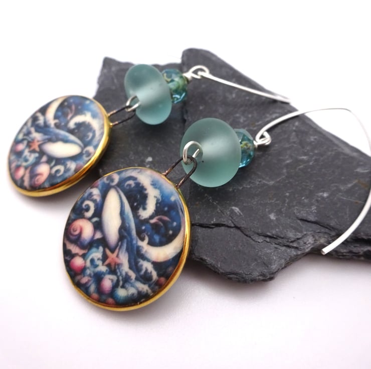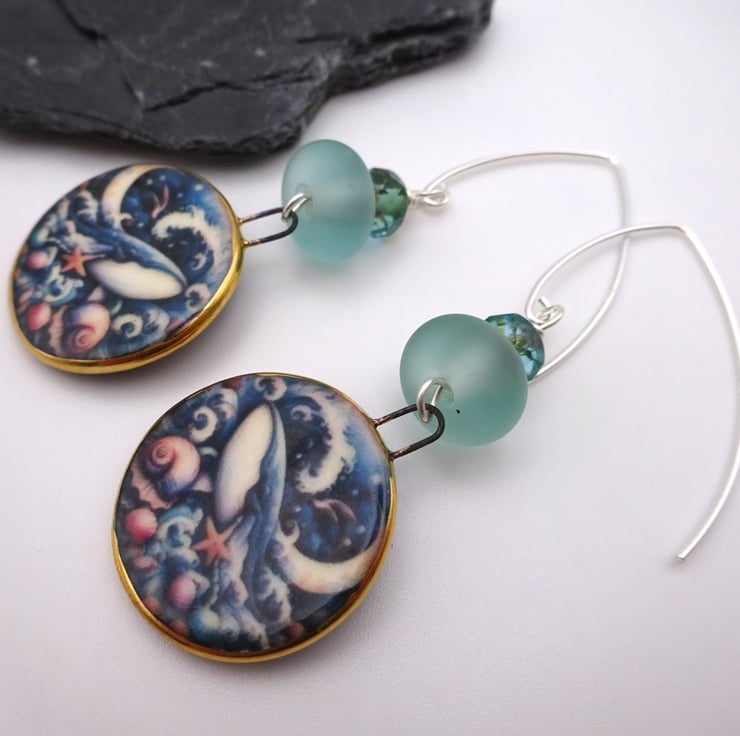 A pair of earrings made with sterling silver ear wires, handmade lampwork glass aqua frosted beads and handmade ceramic blue whale charms.