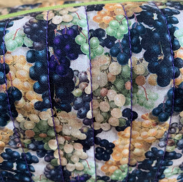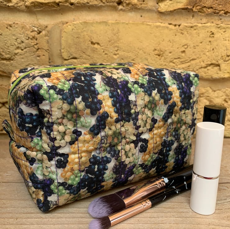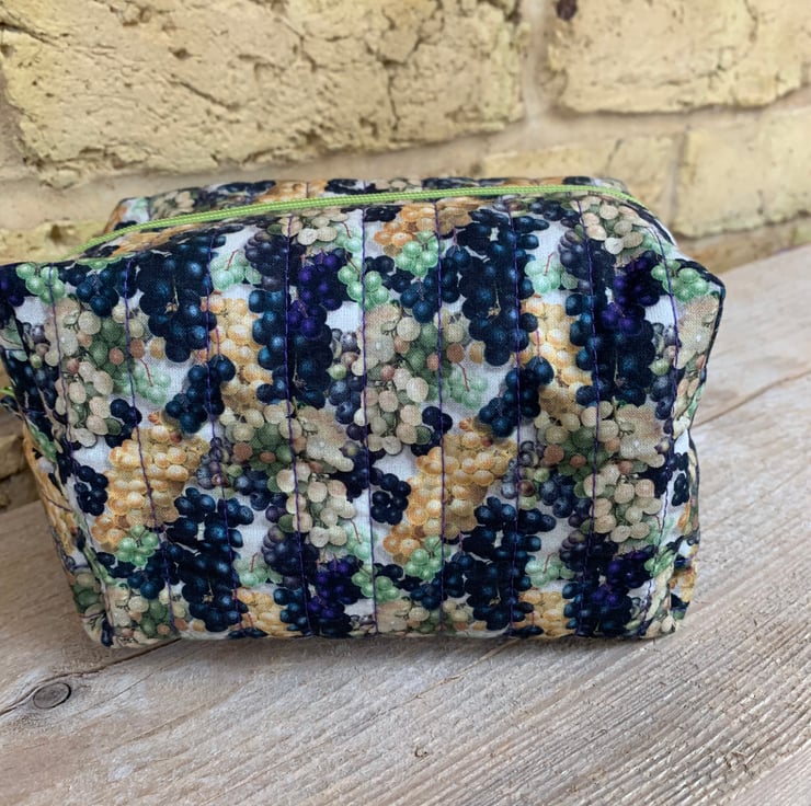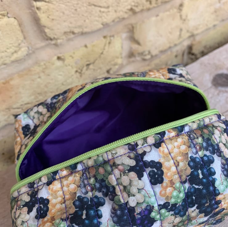 The box shaped makeup bag is made in this lovely grape print cotton fabric ( a perfect gift for wine lovers!) The bag is quilted with purple stitching and has a lime green colour zip.