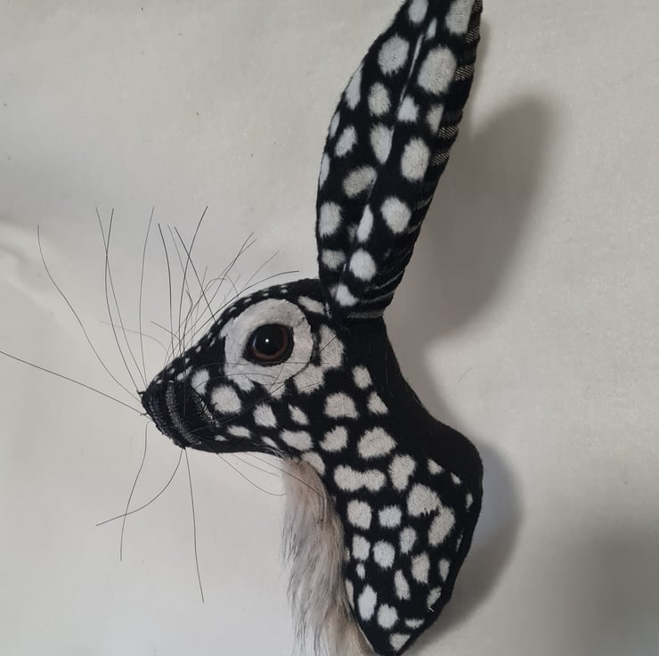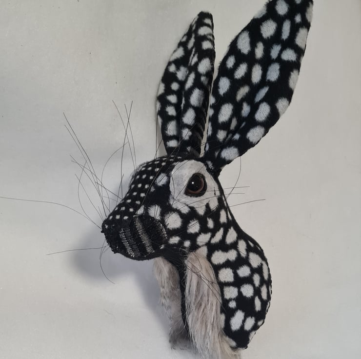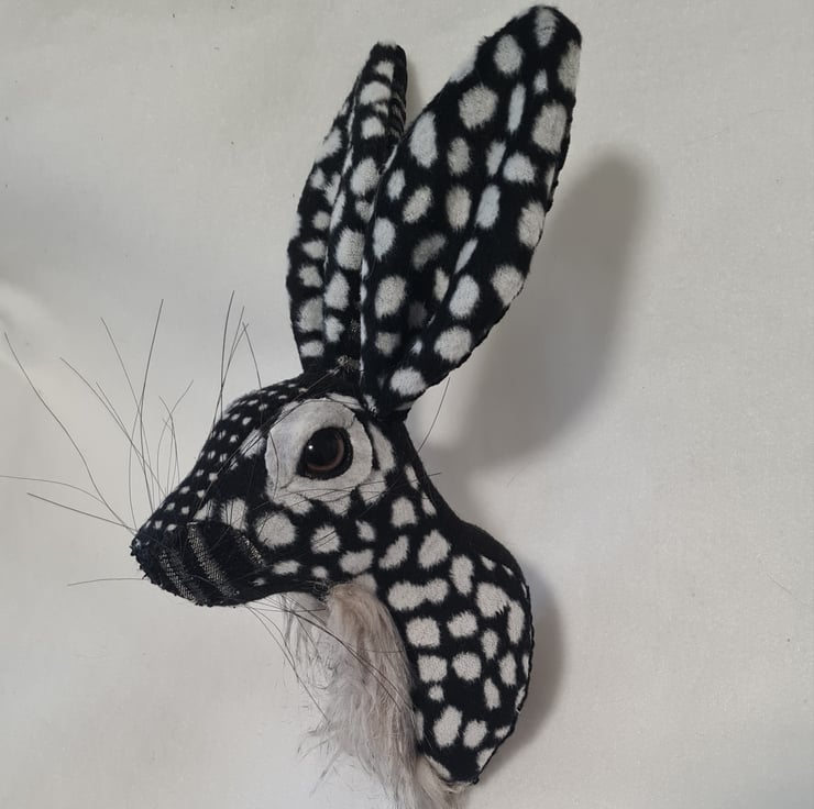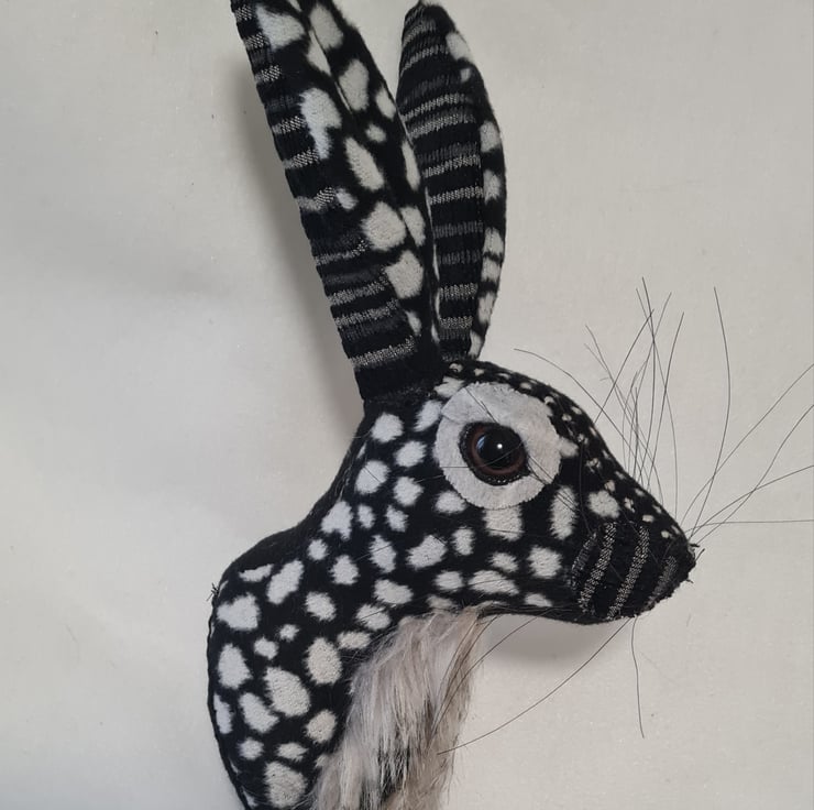 A lifesize faux hare which I have handmade and covered in hand stitched black and grey micro fur fabric. The head is backed with felt and has a metal hanger to hang it on the wall. It is lightweight.