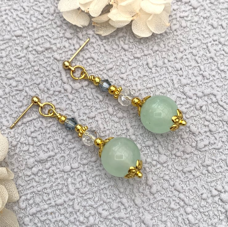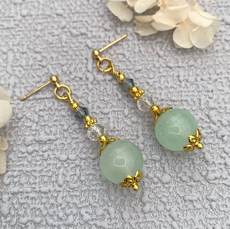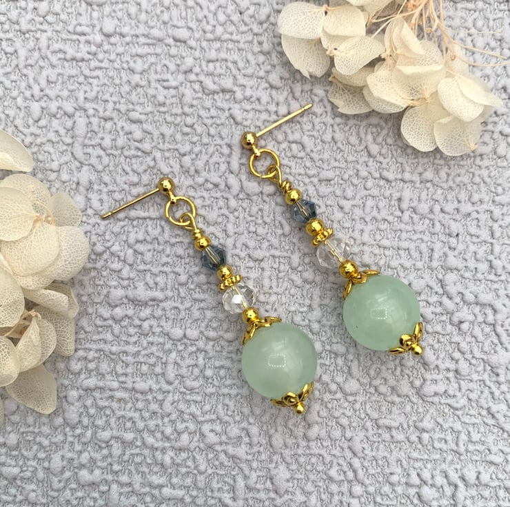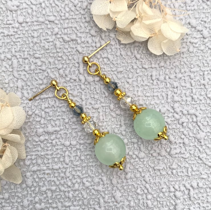 These pretty earrings are made with jade gemstone beads that 12mm diameter. The earrings include gold bead caps, gold-plated beads and glass crystal beads. The earrings are finished with gold-plated ear posts and they are 4cm in total length.