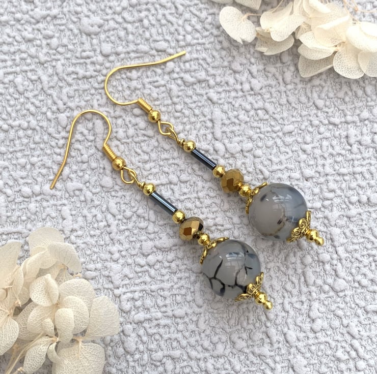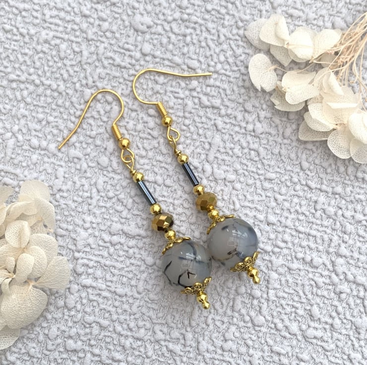 - Crackle Agate Gemstone and Gold Vintage Style Drop Earrings -
