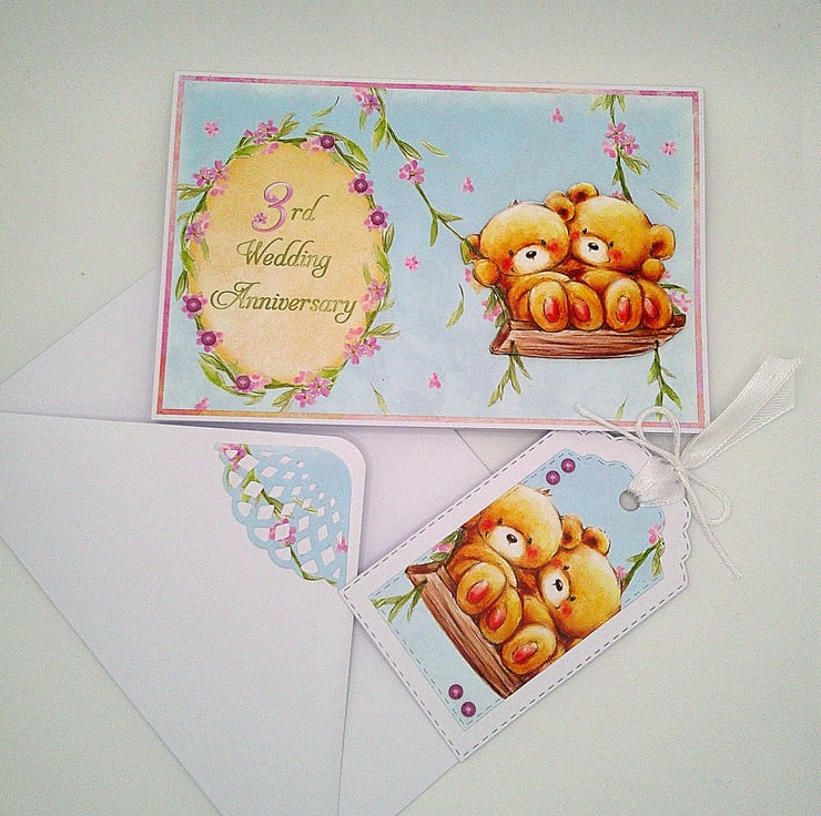 Third Anniversary Card with matching gift tag and envelope - Cute Bear Couple