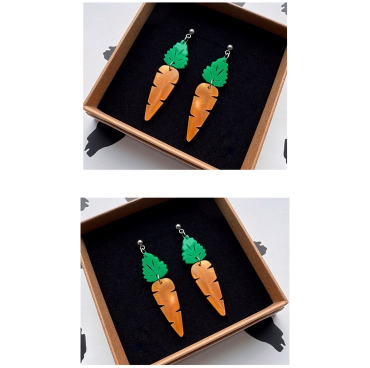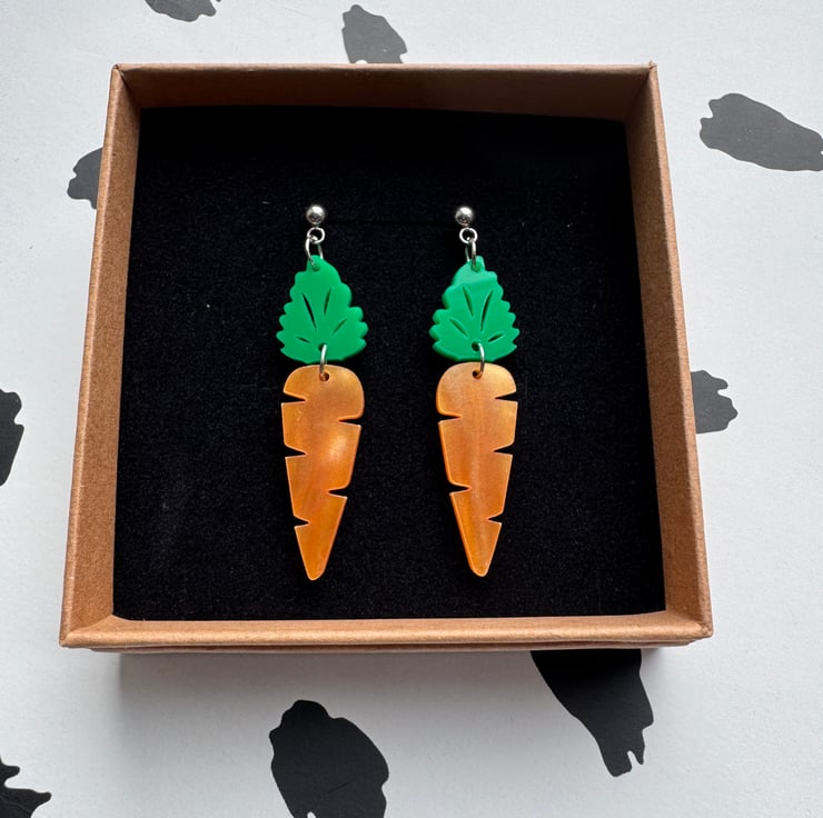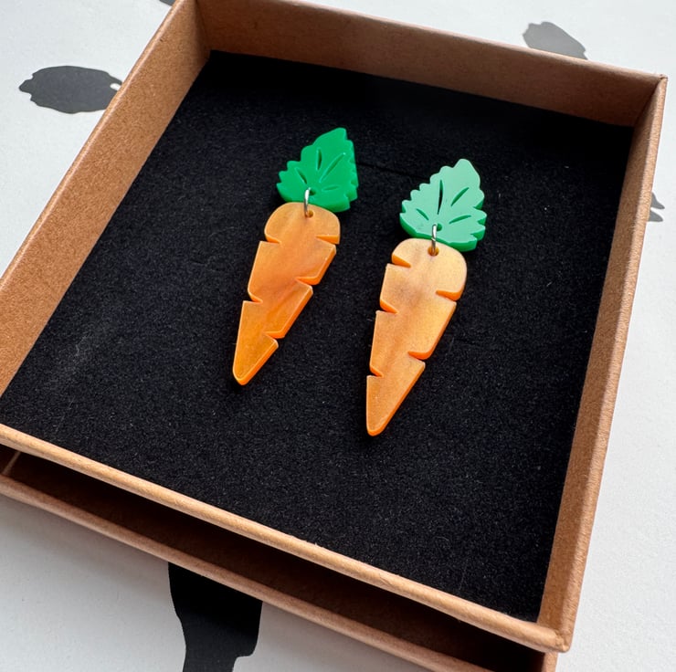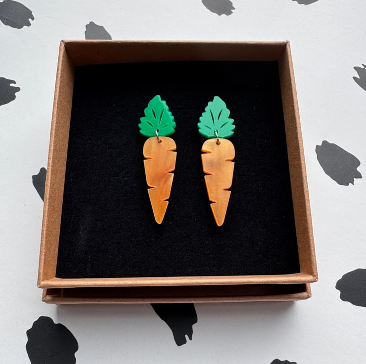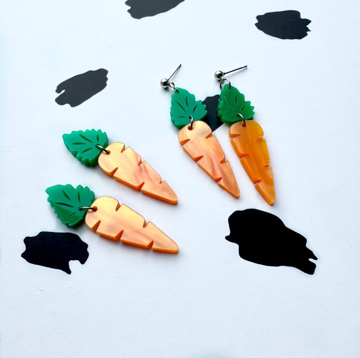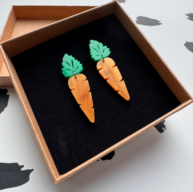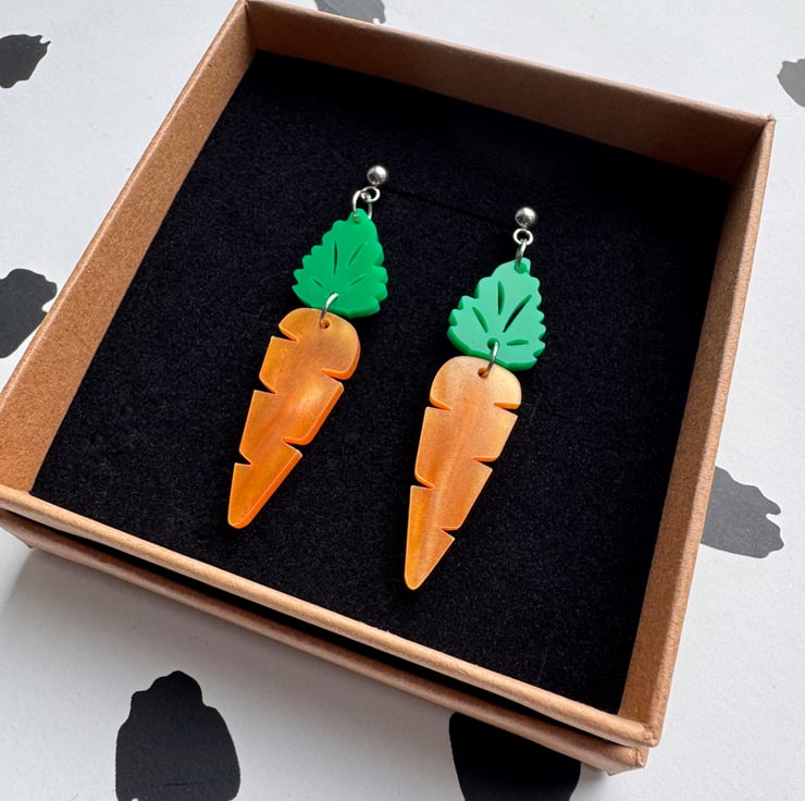 Acrylic Laser Cut carrots, with a bold green carrot leaf top and stunning pearlised marble Orange Carrot accompaniment.