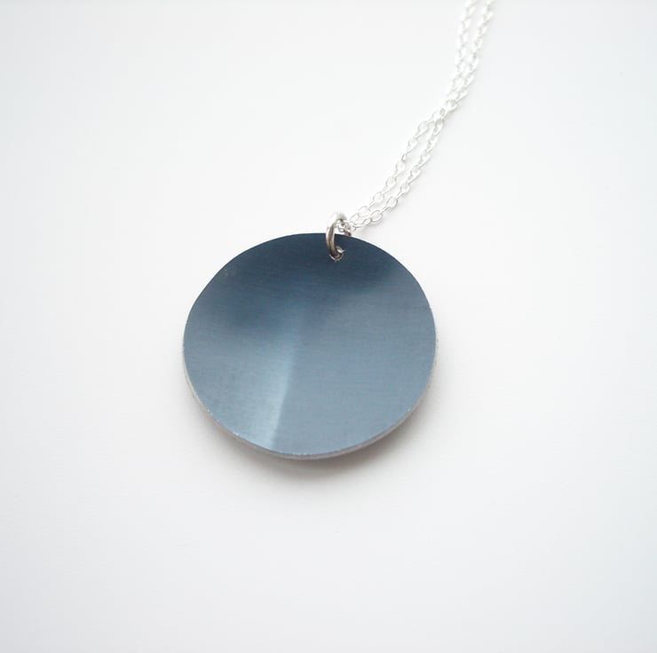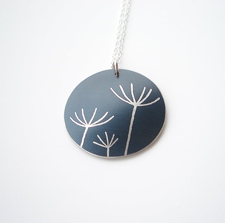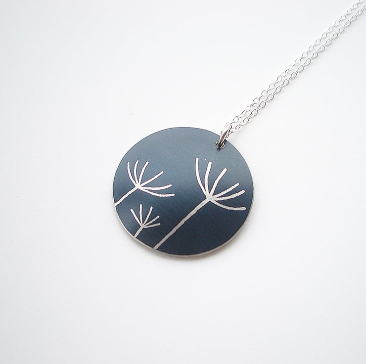 This striking pendant is hand made from aluminium which I have dyed black and printed with a delicate dandelion seed design. I cut out the disc shape by hand and file the edges to reveal the bright silver aluminium underneath. Finally I dome the metal slightly so that it catches the light.