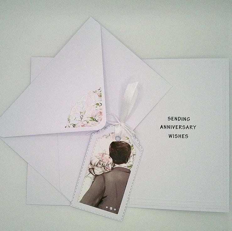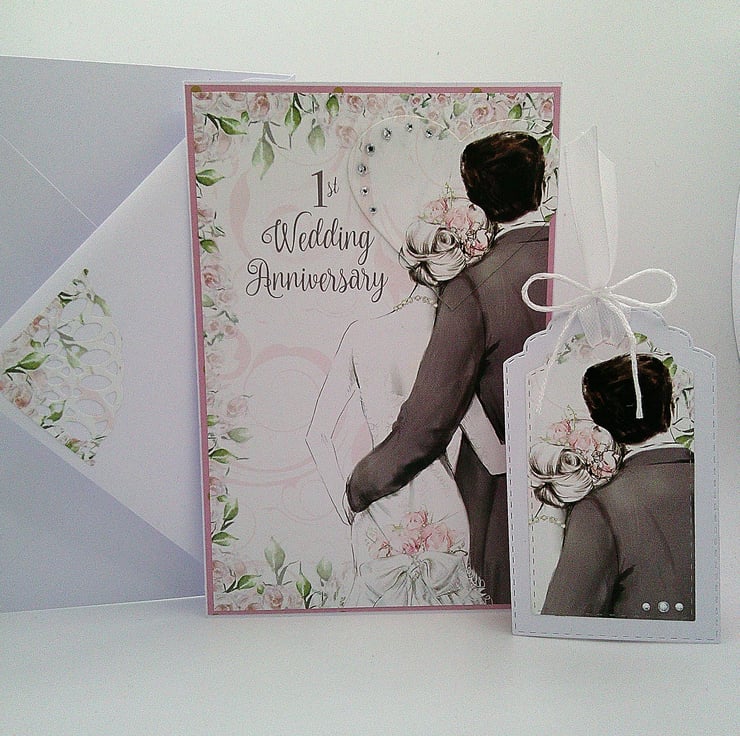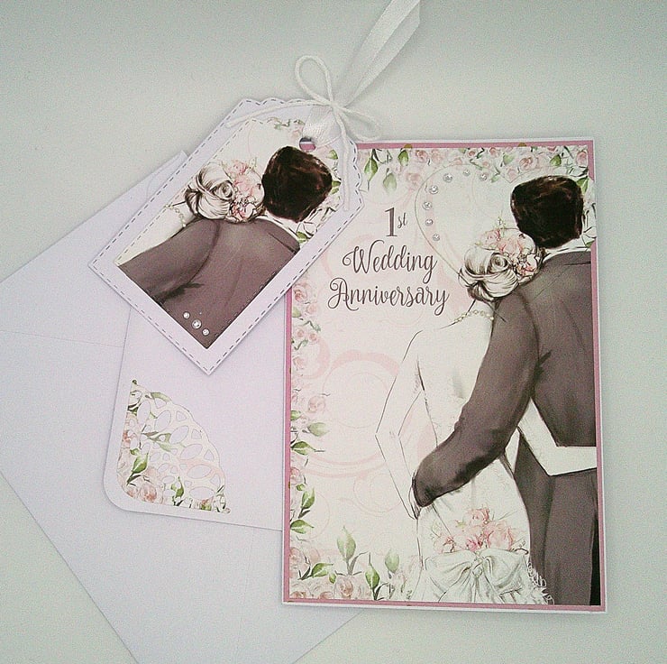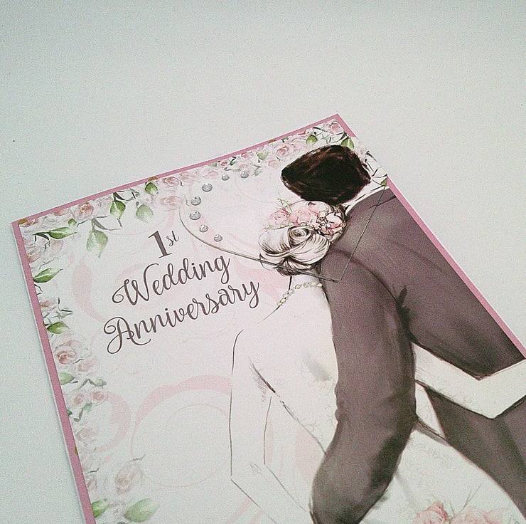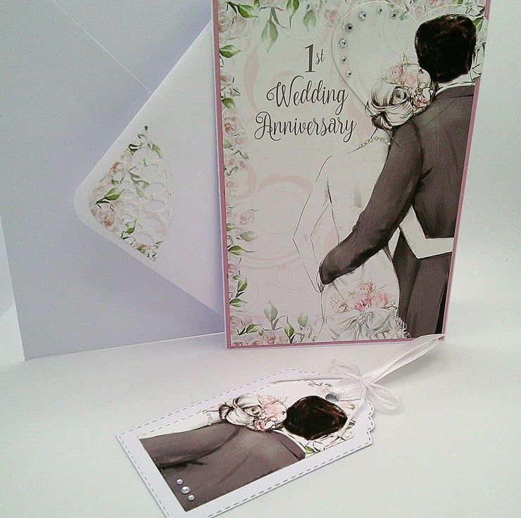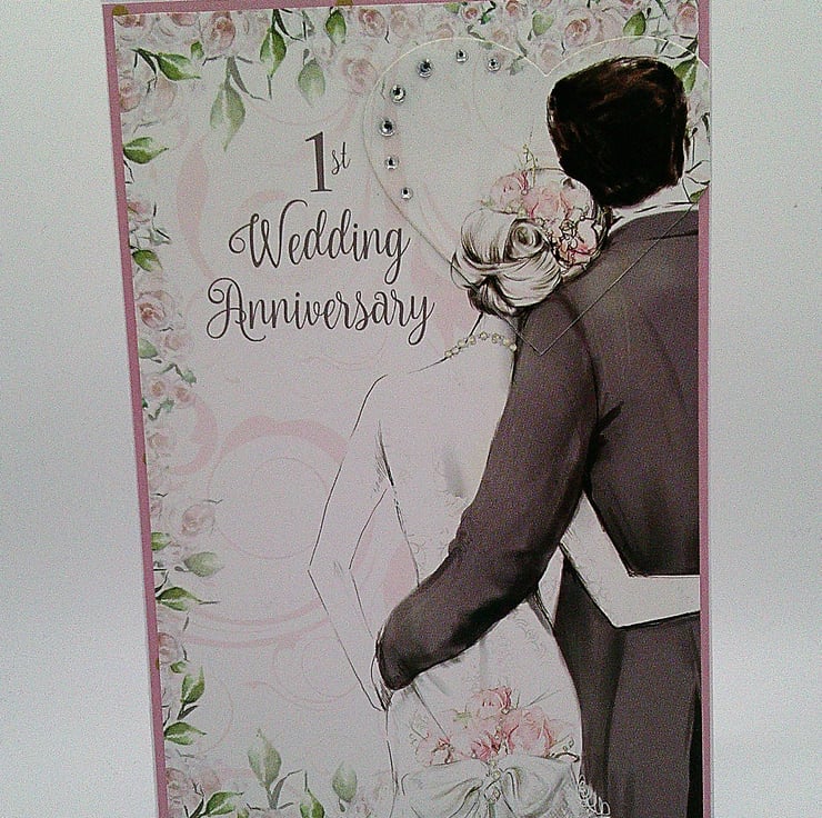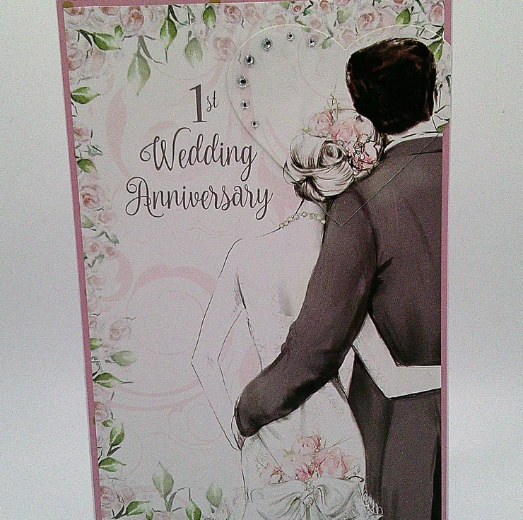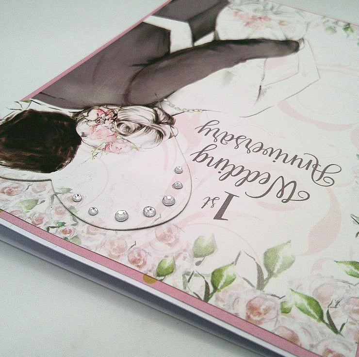 Featuring a couple on their wedding day, this handmade 1st wedding anniversary card has been finished off with diamante style embellishments and a slightly raised heart element.