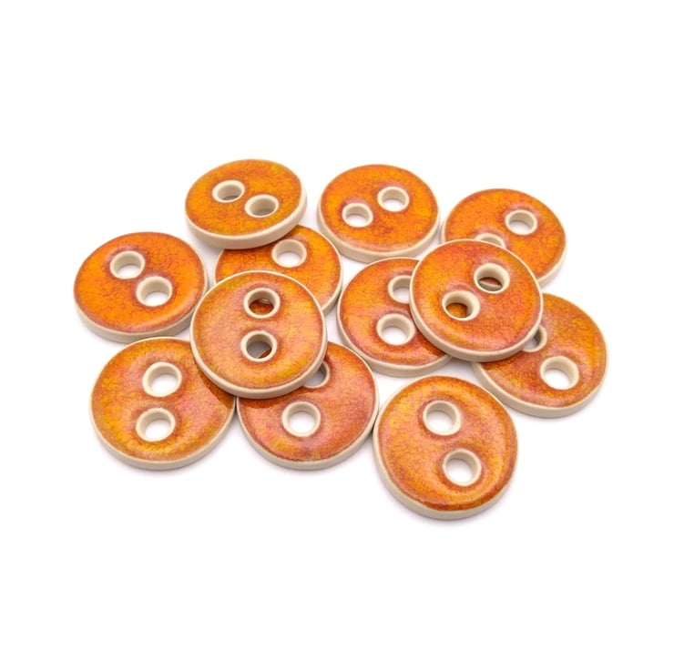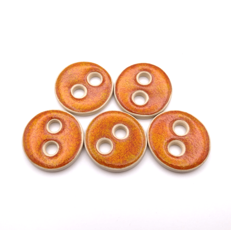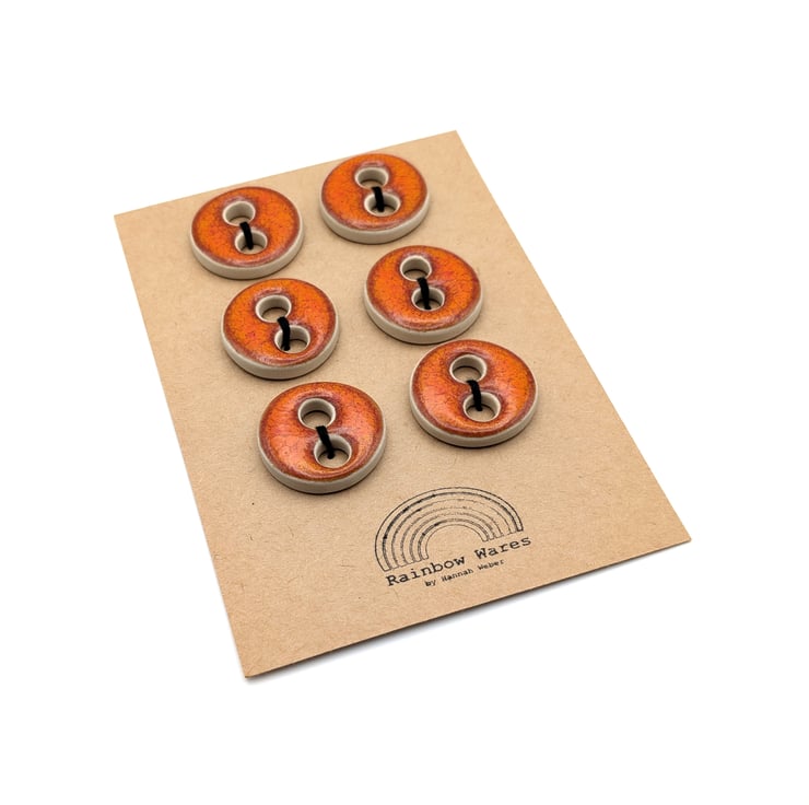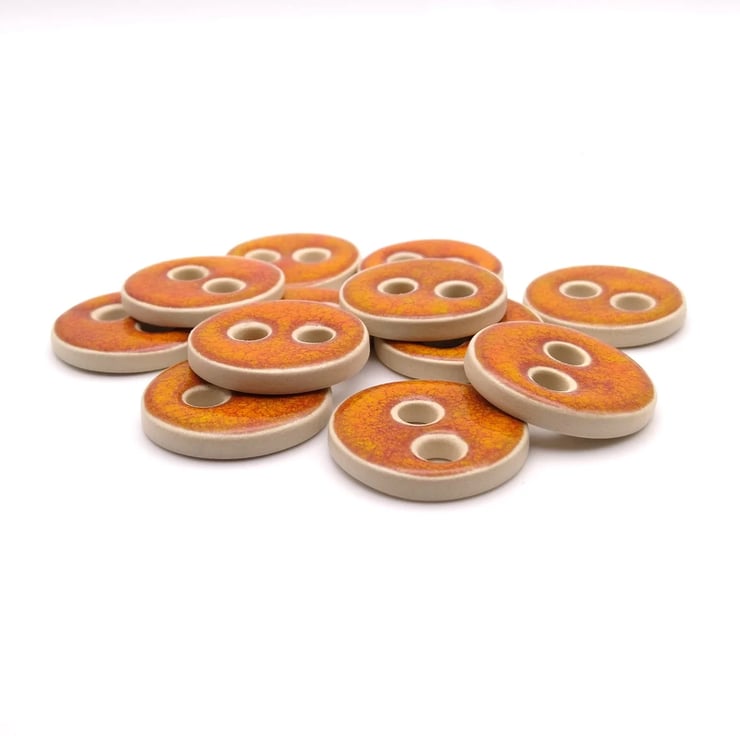 Set of 6 medium round handmade ceramic buttons decorated with fiery orange effect glaze and made from a white stoneware clay. Ideal to complete your knitting, crochet, sewing or other unique craft project!