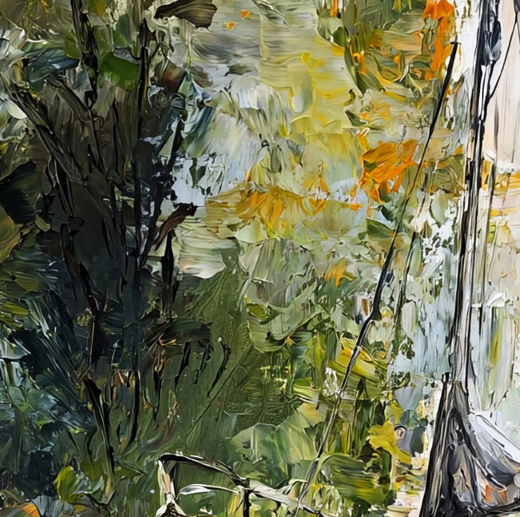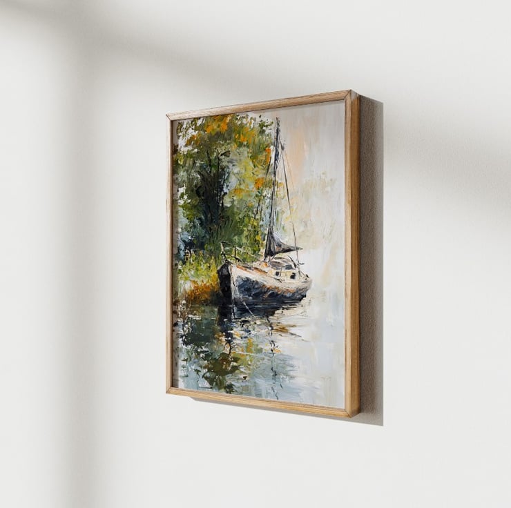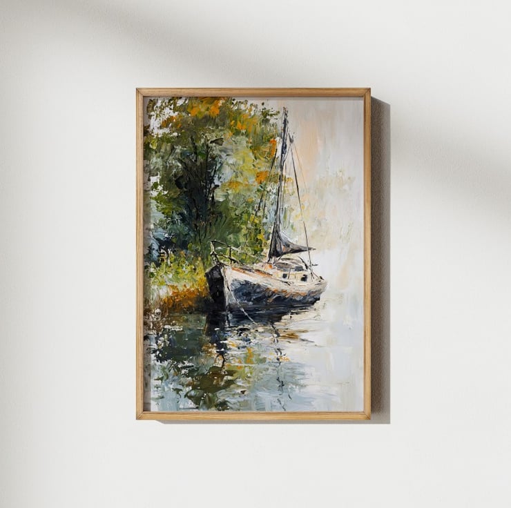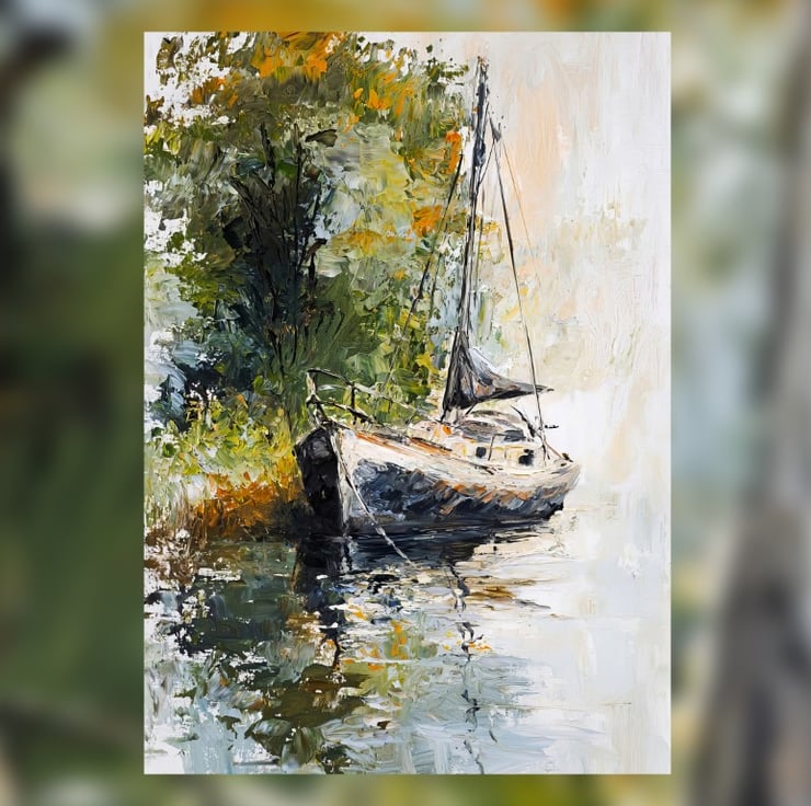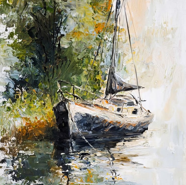 This sailboat painting captures the essence of serenity with a beautifully docked boat resting on still waters. The reflection shimmers across the ripples, blending seamlessly with the lush, impressionistic background. Vibrant greens and warm earth tones add depth, creating a scene that evokes a peaceful retreat by the shore.
