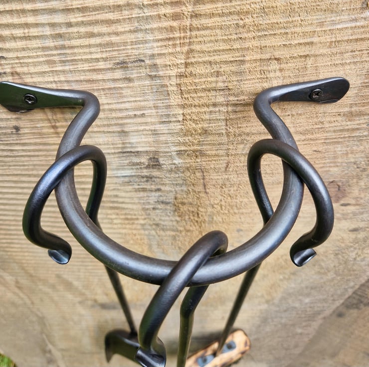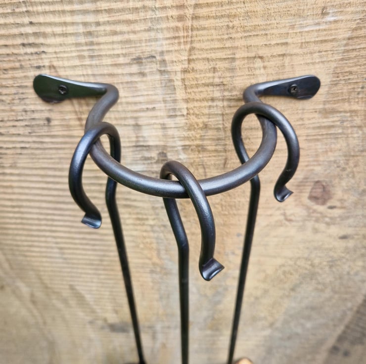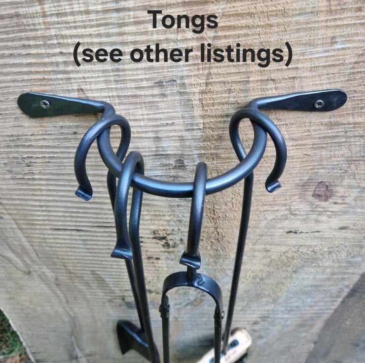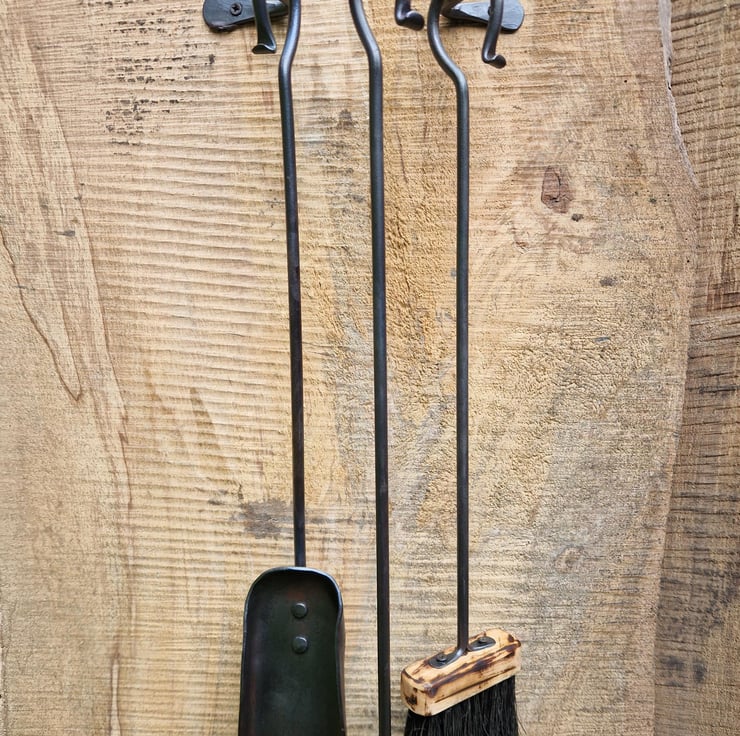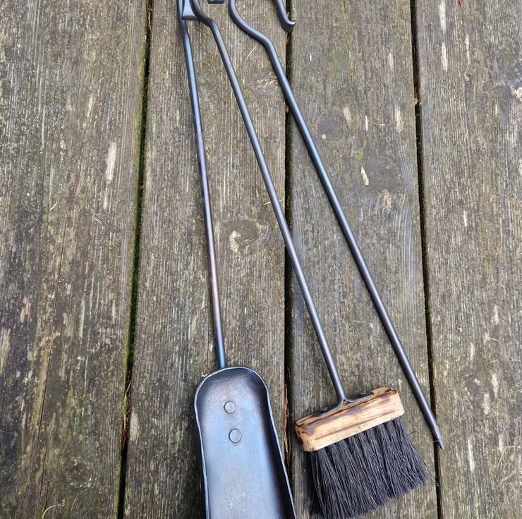 An elegantly hand forged fire set comprising of a fire poker, block brush and a shovel connected with traditional hand rivets. (no welding)