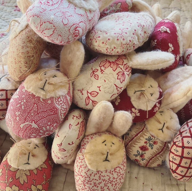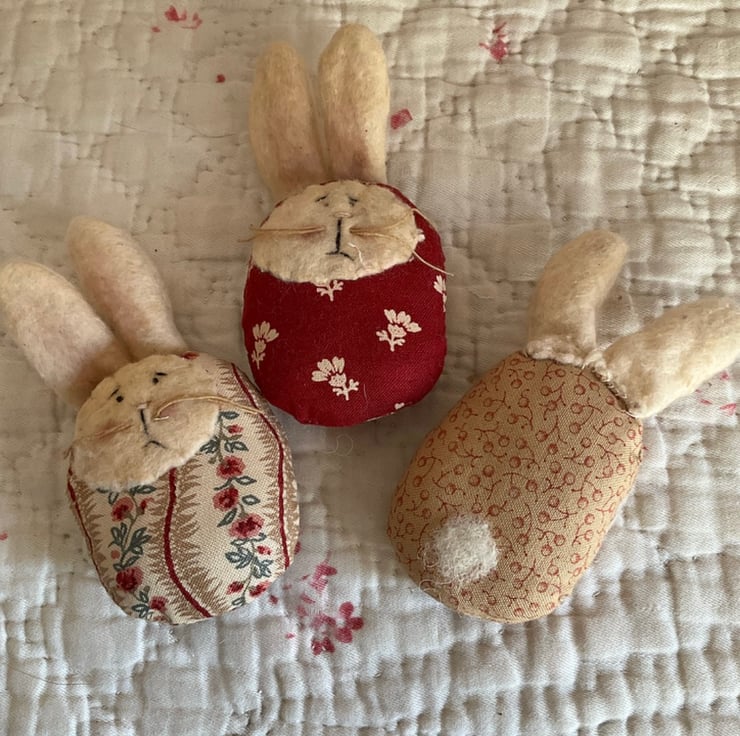 A set of 3 adorable miniature bunnies with bob tails. Hand stitched facial features and whiskers. Display in bowls, sit on a shelf, or add as a gift with Easter chocolates.