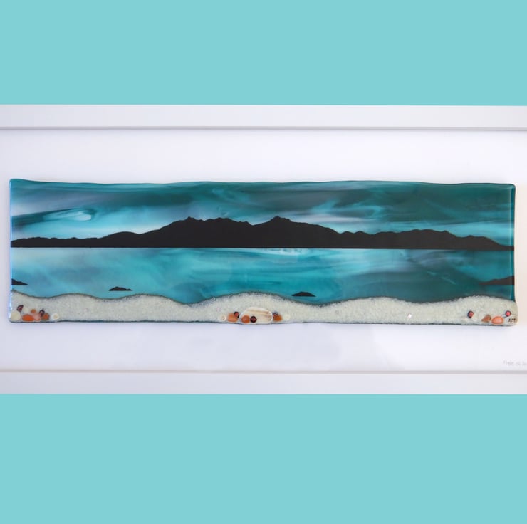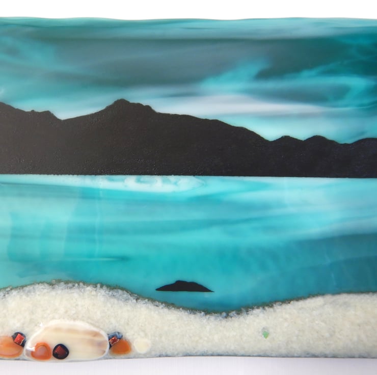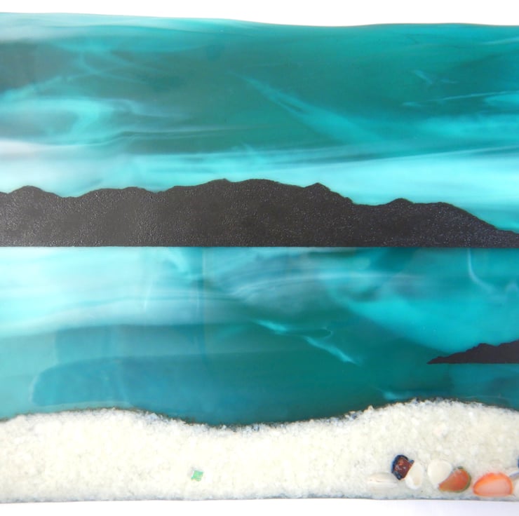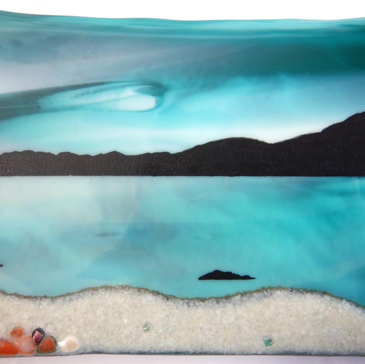 'ISLE OF ARRAN' is a subtle mix of swirling shades of white/turquoise blue, with the island contrasted in black. The actual isle has been very carefully painted using finely ground powdered glass. The foreground is vanilla coloured glass frit set against the streaky blue/turquoise of the sea. A tiny bit of bling has been added by scattering little sections of dichroic glass amongst the sand and rocks. Once the picture was completed it was then fused in my kiln at 1400 where all sections became one!
