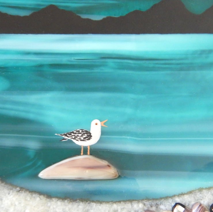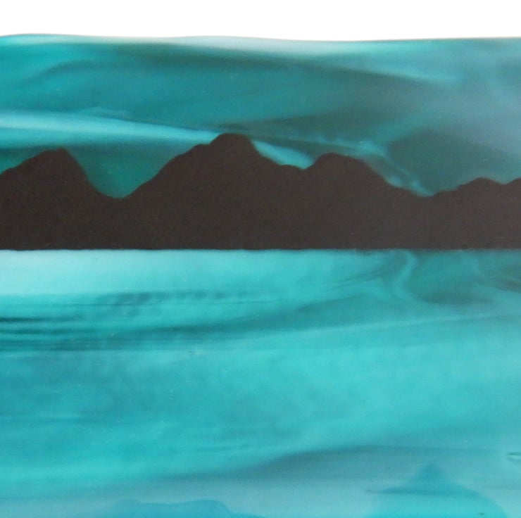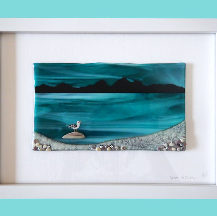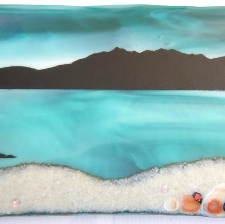 'PAPS OF JURA' is a subtle mix of swirling shades of white/turquoise blue, with the mountains contrasted in black. The actual isle has been very carefully painted using finely ground powdered glass. The foreground is vanilla coloured glass frit set against the streaky blue/turquoise of the sea. A tiny bit of bling has been added by scattering little sections of dichroic glass amongst the sand and rocks. Once the picture was completed it was then fused in my kiln at 1400 where all sections became one!