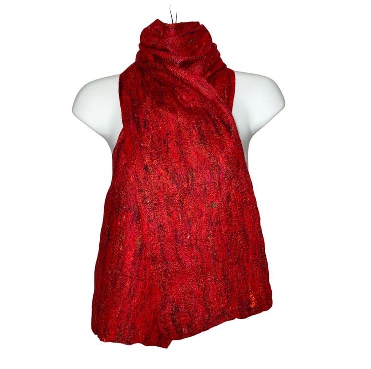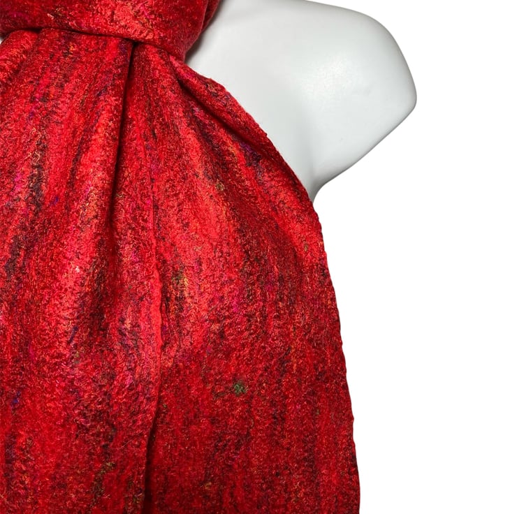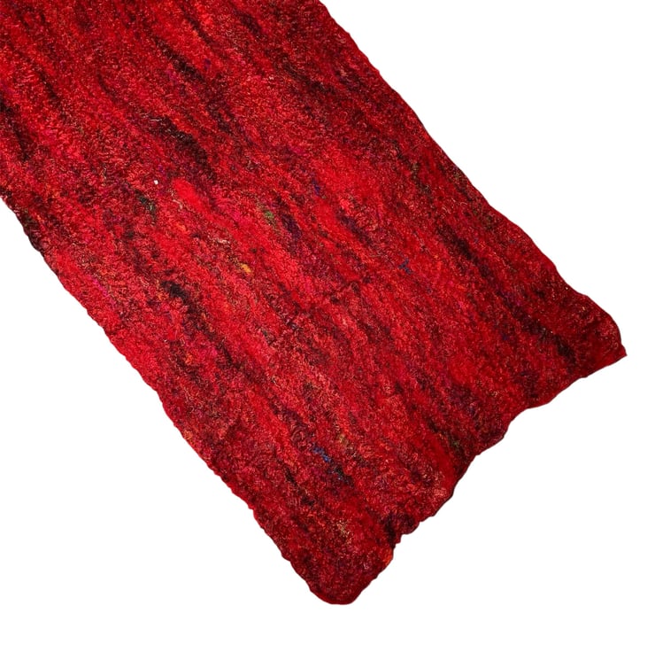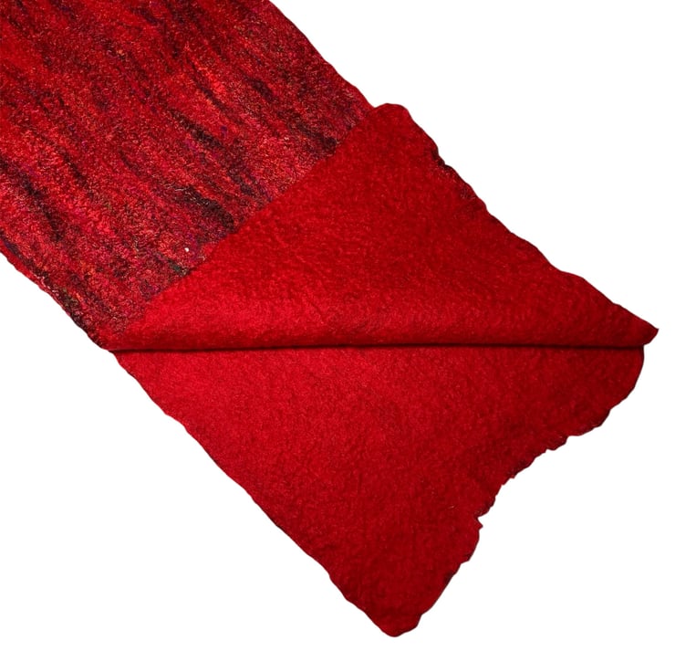 This stunning scarf has been made using bright scarlet merino wool fibres and a blend of recycled sari silk fibres. Fine layers of merino wool have been topped with a layer of silk fibres and wet felted, a process that binds the fibres together and creates a stable fabric. The resulting scarf is beautifully soft with the silk adding colour, texture and a lustrous sheen to the surface.