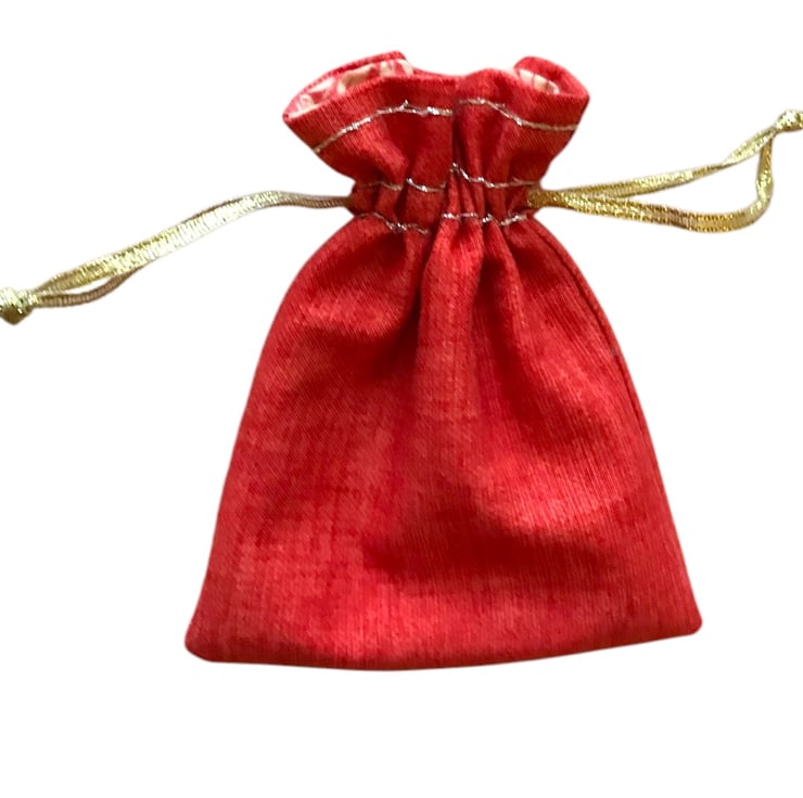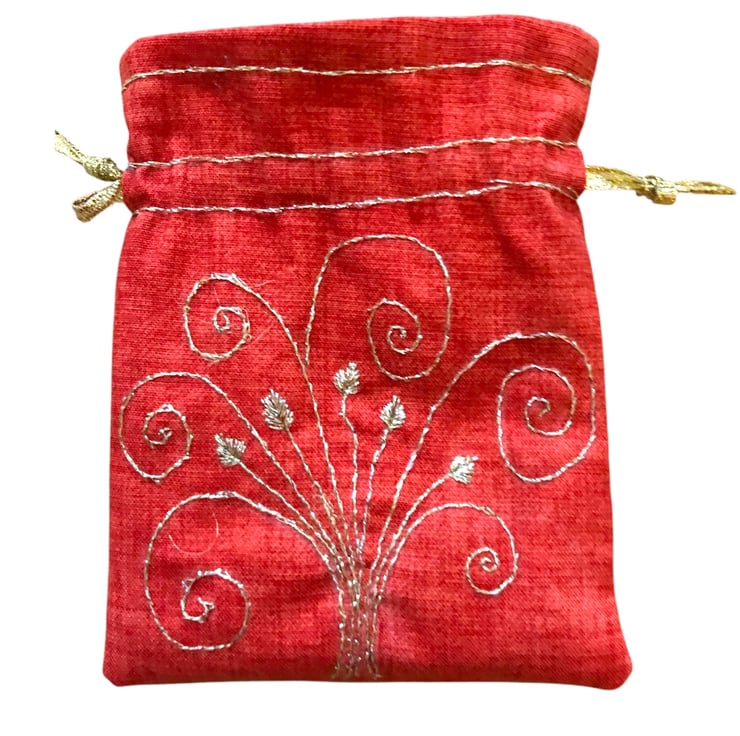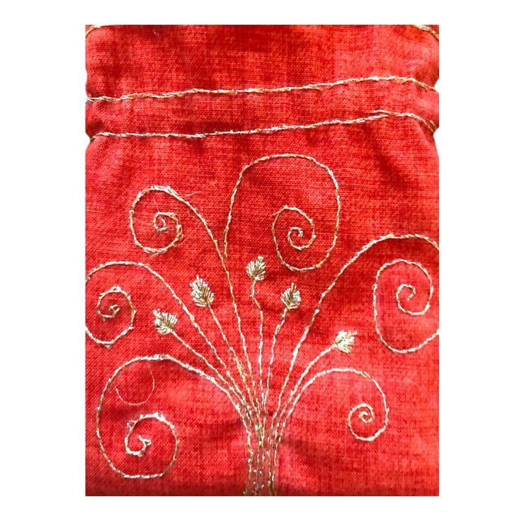This is a small orange fabric drawstring gift bag with a hand embroidered gold tree design on the front. It measures 12 cms long by 10 cms wide. It is fully lined with matching orange lining.