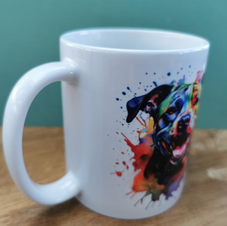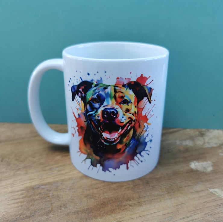 This colour splash mug showcases the all too often maligned Staffie, showing its characteristic smile this dog enjoys the company of people and at one time was nicknamed "the nanny dog" because it was so protective of children. For just an additional £2.00 you can add a matching coaster.