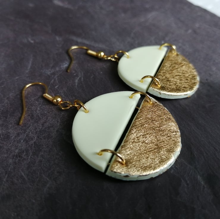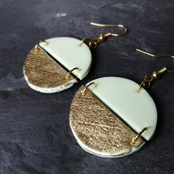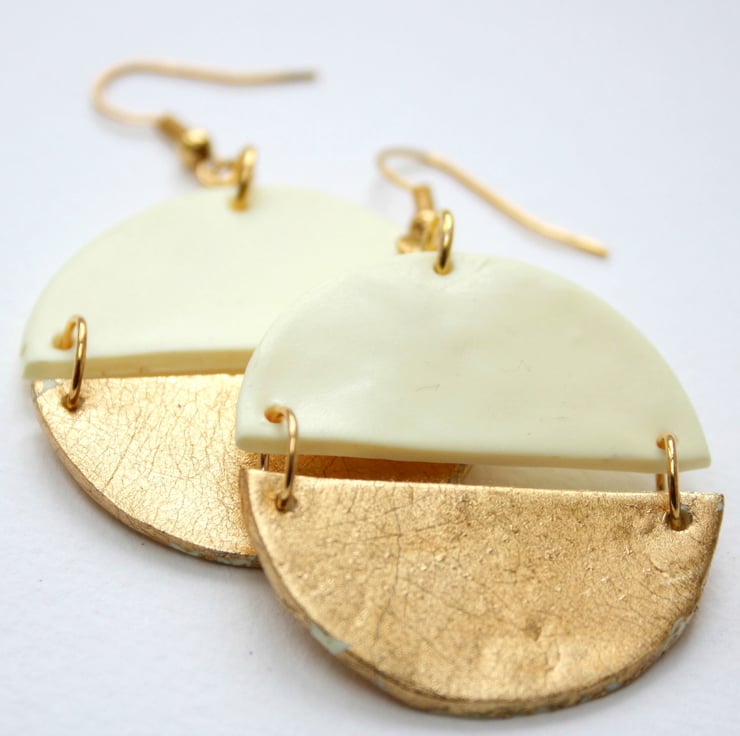 I will make these lovely soft yellow and gold earrings to order. They are very lightweight and won´t pull your earlobes down. I use Polymer clay and 24k gold leaf to make the clay half circles.