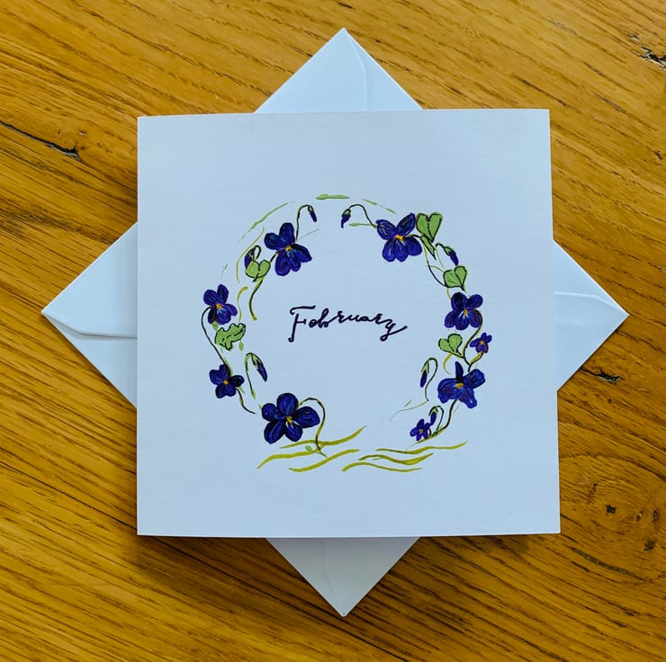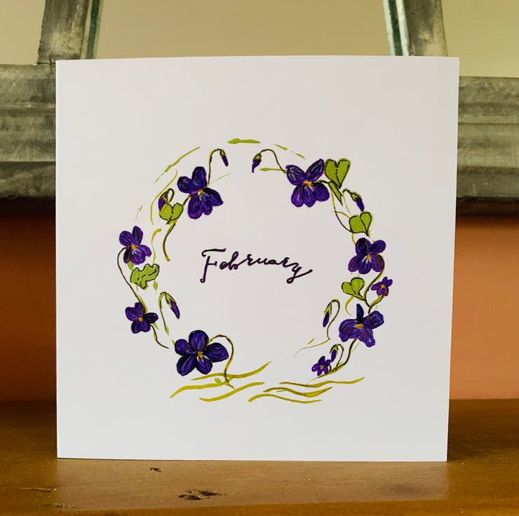 Hand painted in acrylics and water colour this card depicts one of February’s flowers of the month, the beautiful violet. Blank inside for your own message. Complete with envelope.