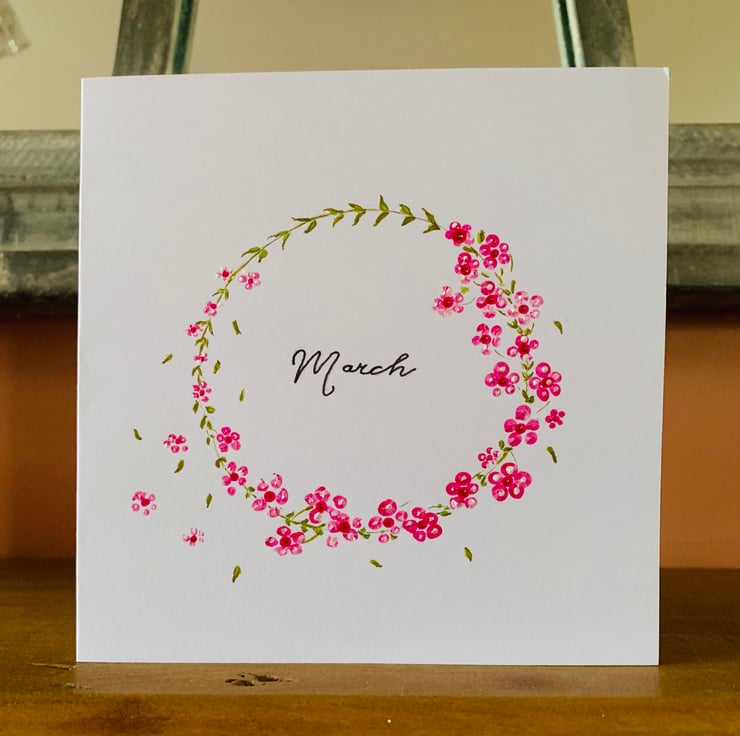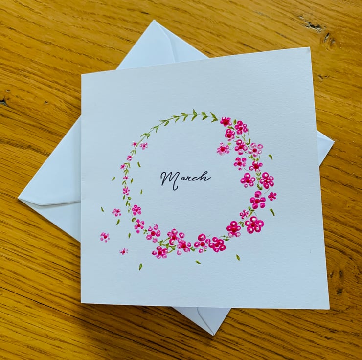 Painted in acrylics and watercolour this card depicts one of March’s flowers of the month, Sakura or cherry blossom. Blank inside for your own words, perfect for a birthday, anniversary or Mother’s Day. Complete with envelope.