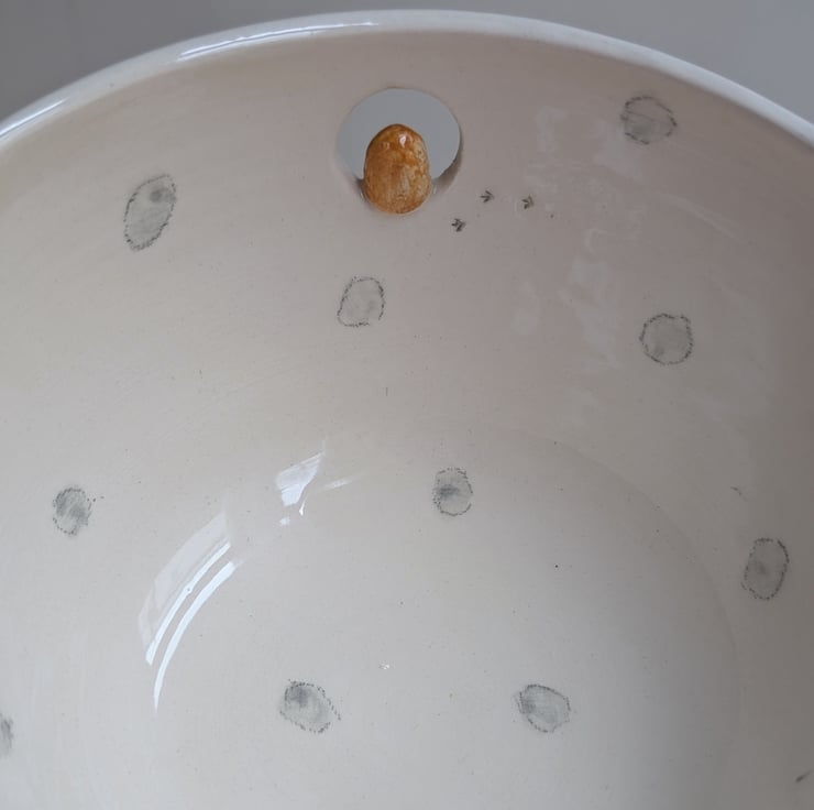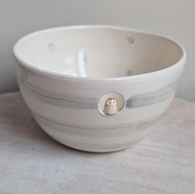 Handmade pottery bowl in white clay with hand painted owl grey stripes and spots. This little bowl is a one off piece.
