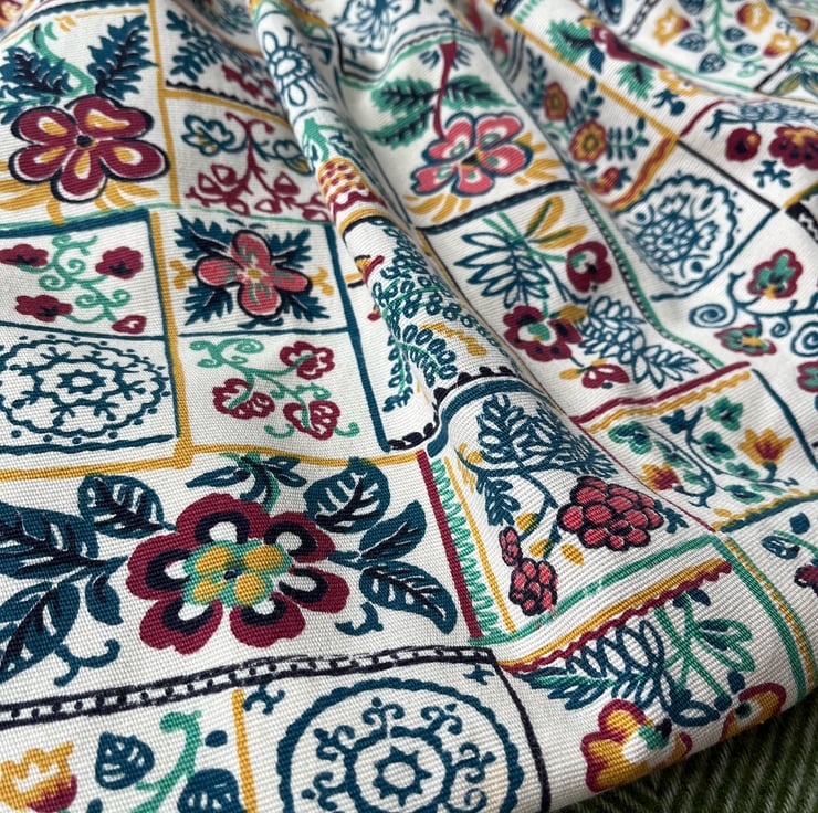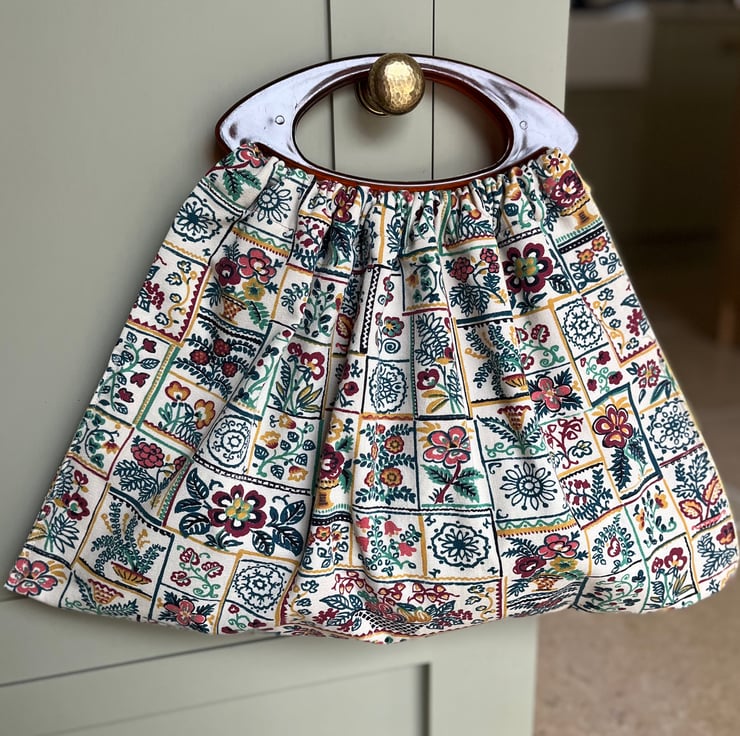 One of a kind vintage style bag with pretty retro print floral fabric gathered onto plastic translucent handles. The bag is fully lined with reclaimed soft yellow floral cotton and has a patch pocket inside.