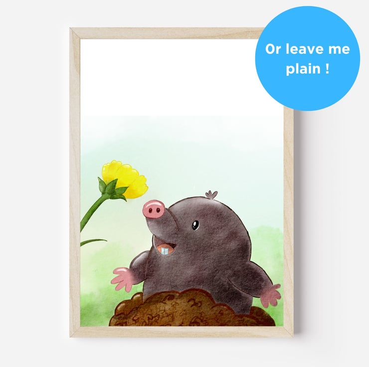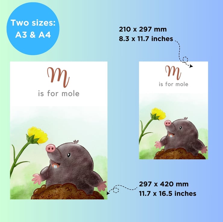 Personalise your print to make it extra special. Alternatively, the print may be printed with the words 'M is for mole' or left blank if you prefer.