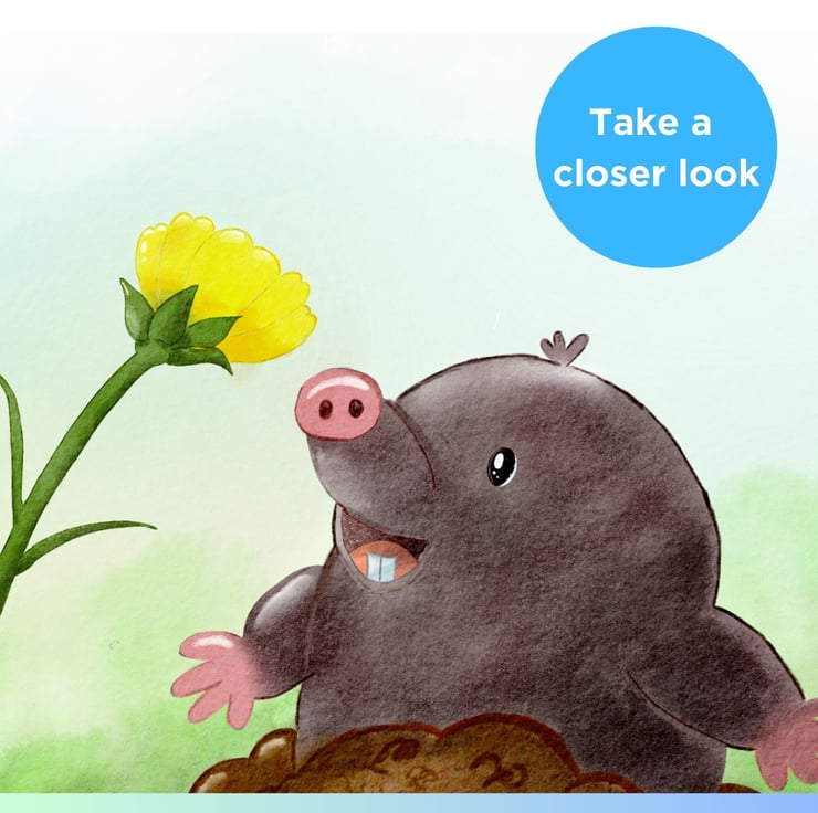 This delightful mole, surprised by the buttercup he has popped up next to, will take your child on a magical wildlife adventure, sparking their imagination, invoking pleasure and joy. Such fun!